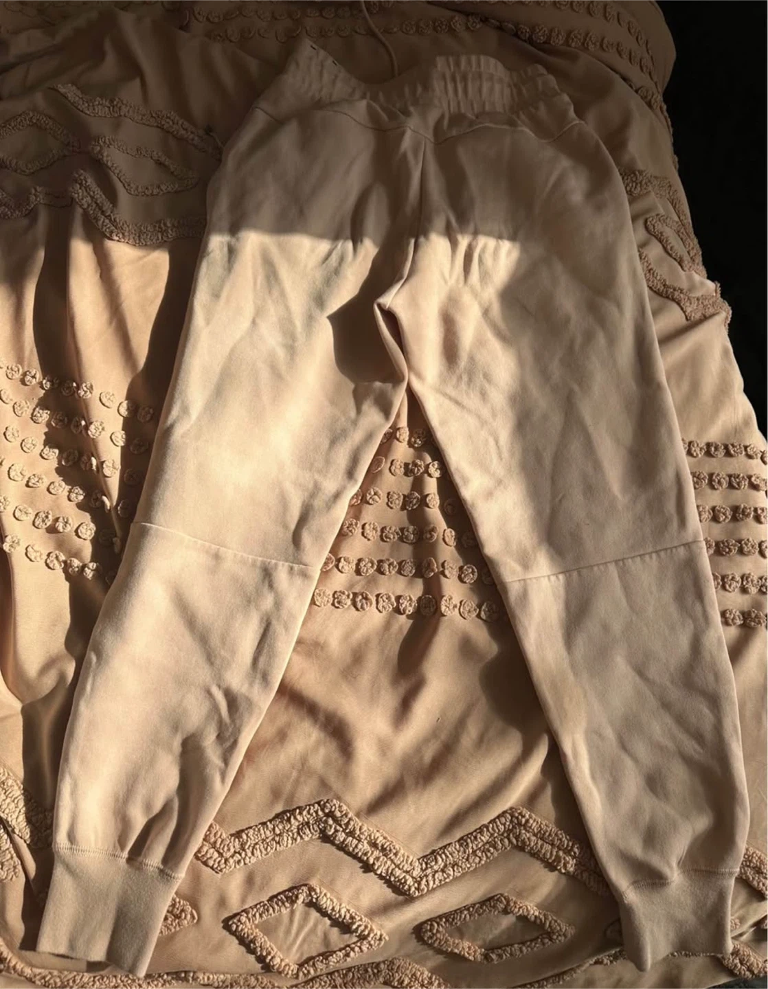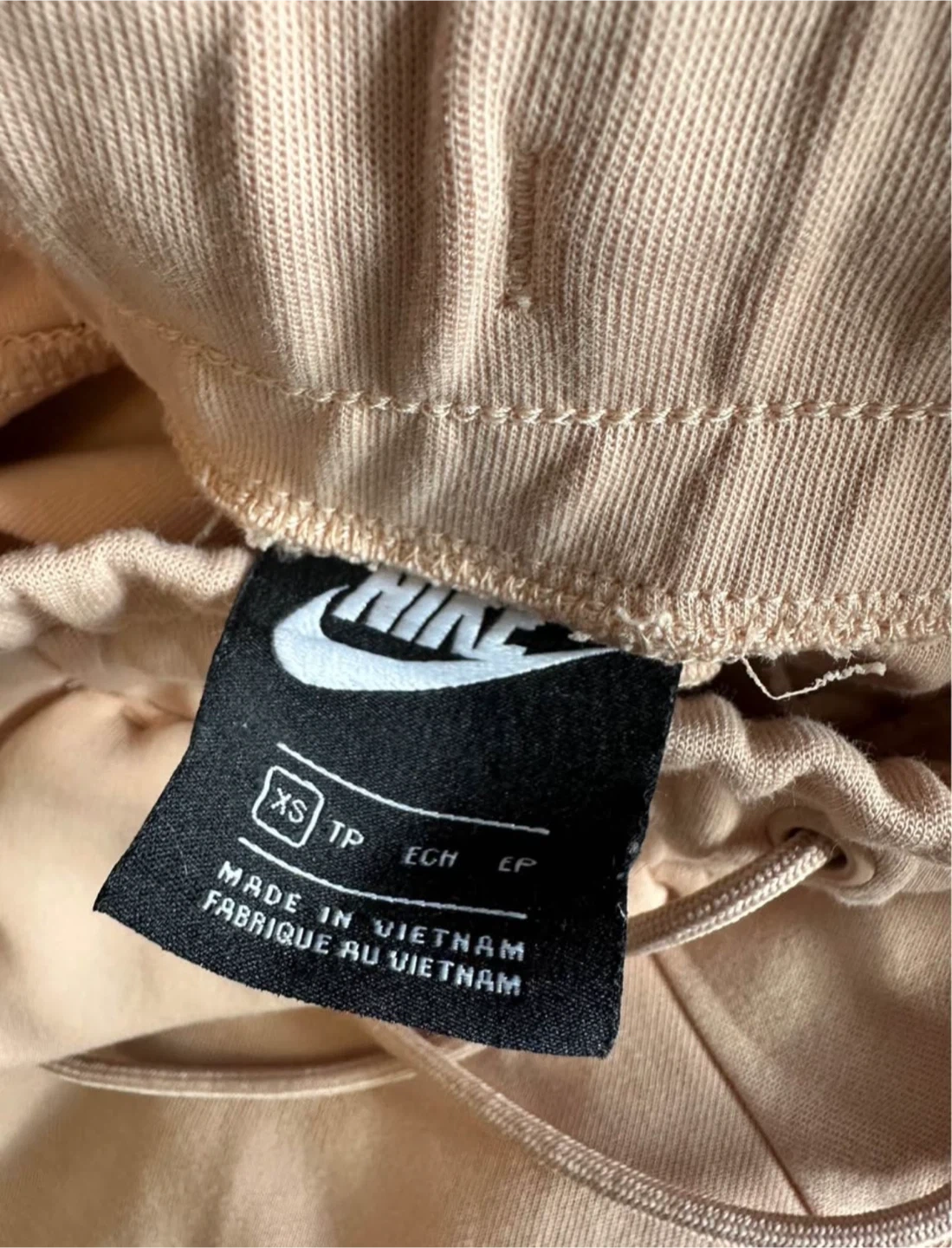 These are Nike women's jogger sweatpants in a beige colour. Size is extra small (XS) and they're made in Vietnam. The fabric feels like a soft cotton blend, perfect for casual wear or light workouts.