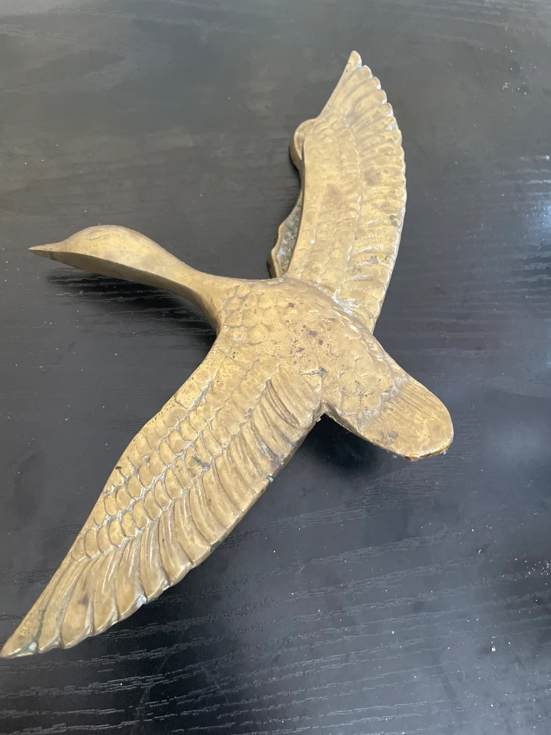 This is a solid brass decorative piece shaped like a flying duck. It measures 10 inches wingspan. The brass shows some patina and age, adding to its vintage charm. This piece would make a lovely addition to a wall or door.