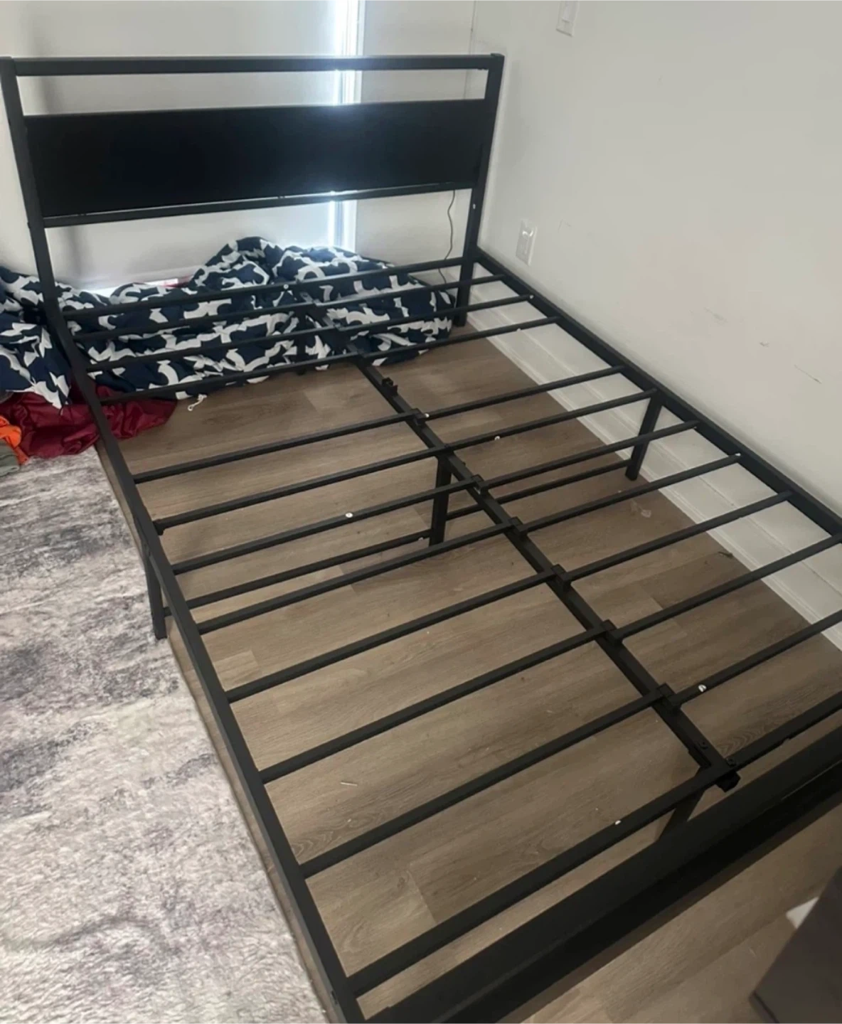 This is a black metal bed frame with a headboard. It's a sturdy platform design that doesn't require a box spring. The metal construction ensures durability. Great for a bedroom or guest room!