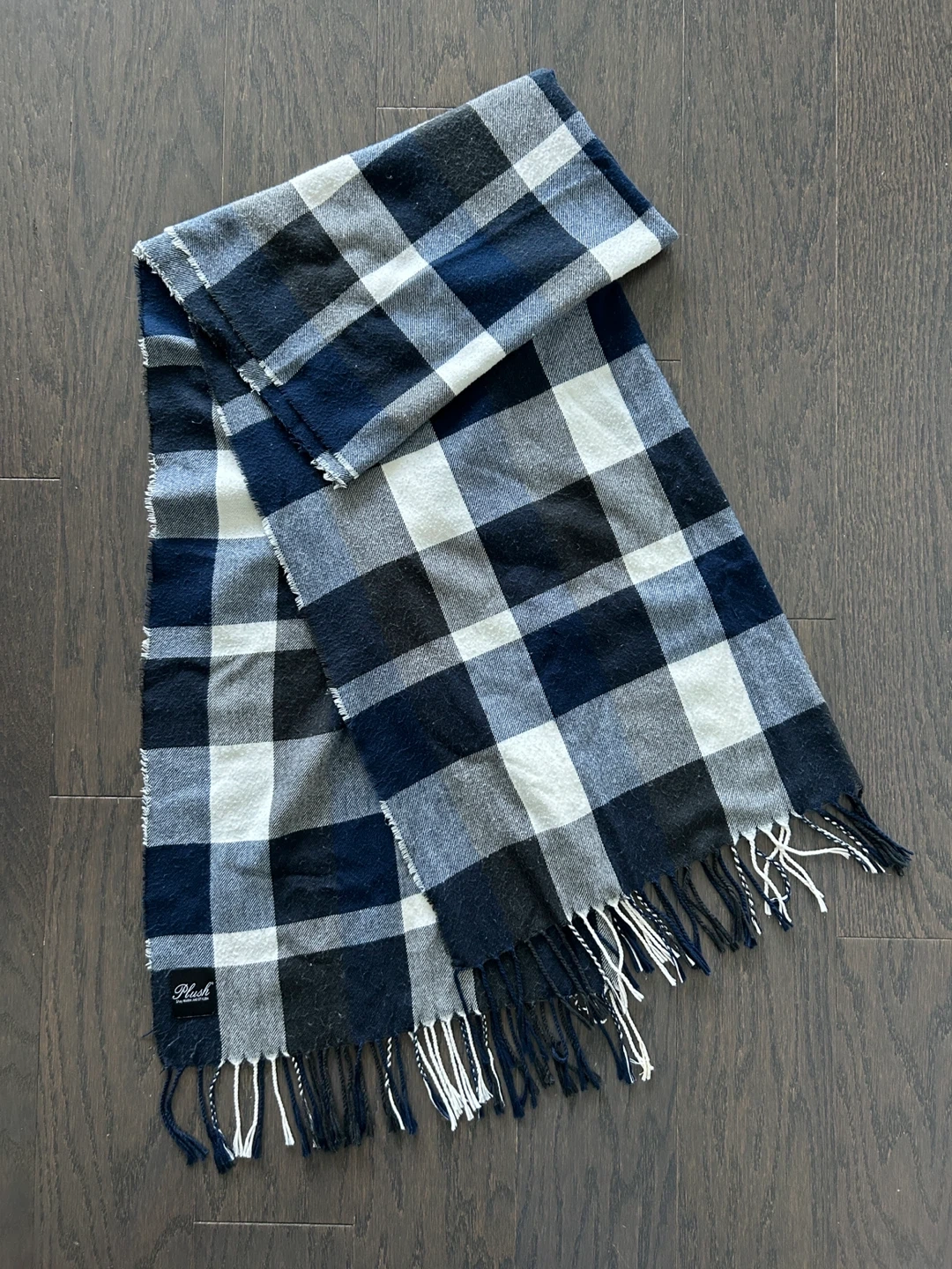 Keep warm and stylish with this Plush scarf! It features a classic blue and white plaid pattern. The material is 70% polyester and 30% rayon. Perfect for adding a touch of cozy charm to any outfit