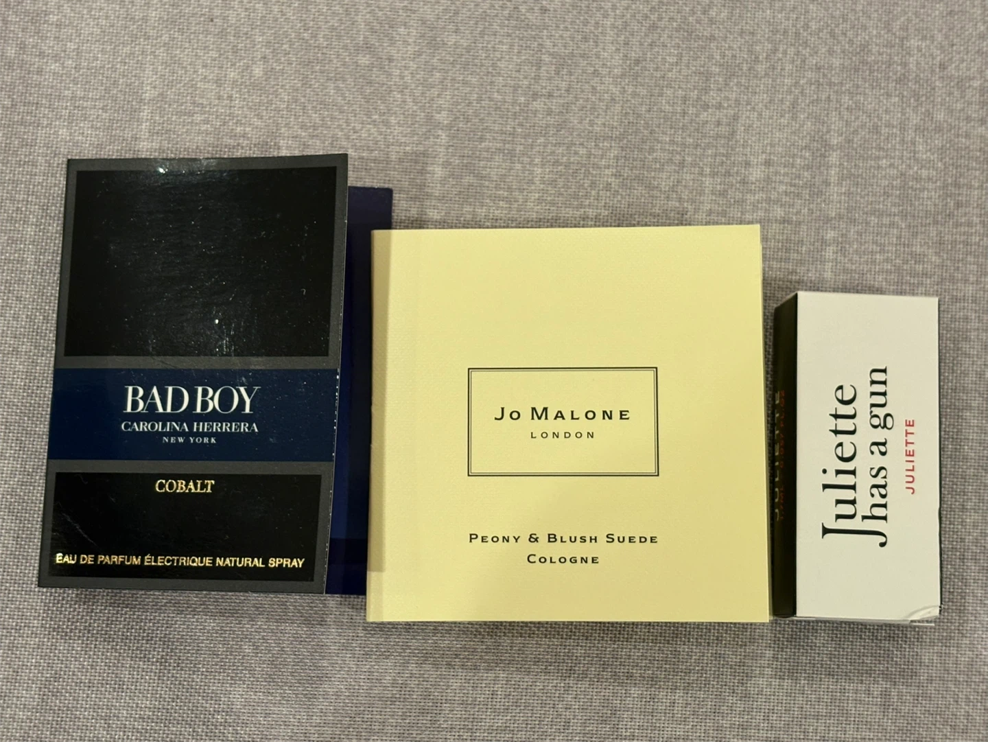 Selling three perfume samples: Carolina Herrera Bad Boy Cobalt Eau de Parfum Électrique Natural Spray, Jo Malone London Peony & Blush Suede Cologne, and Juliette has a gun Juliette.