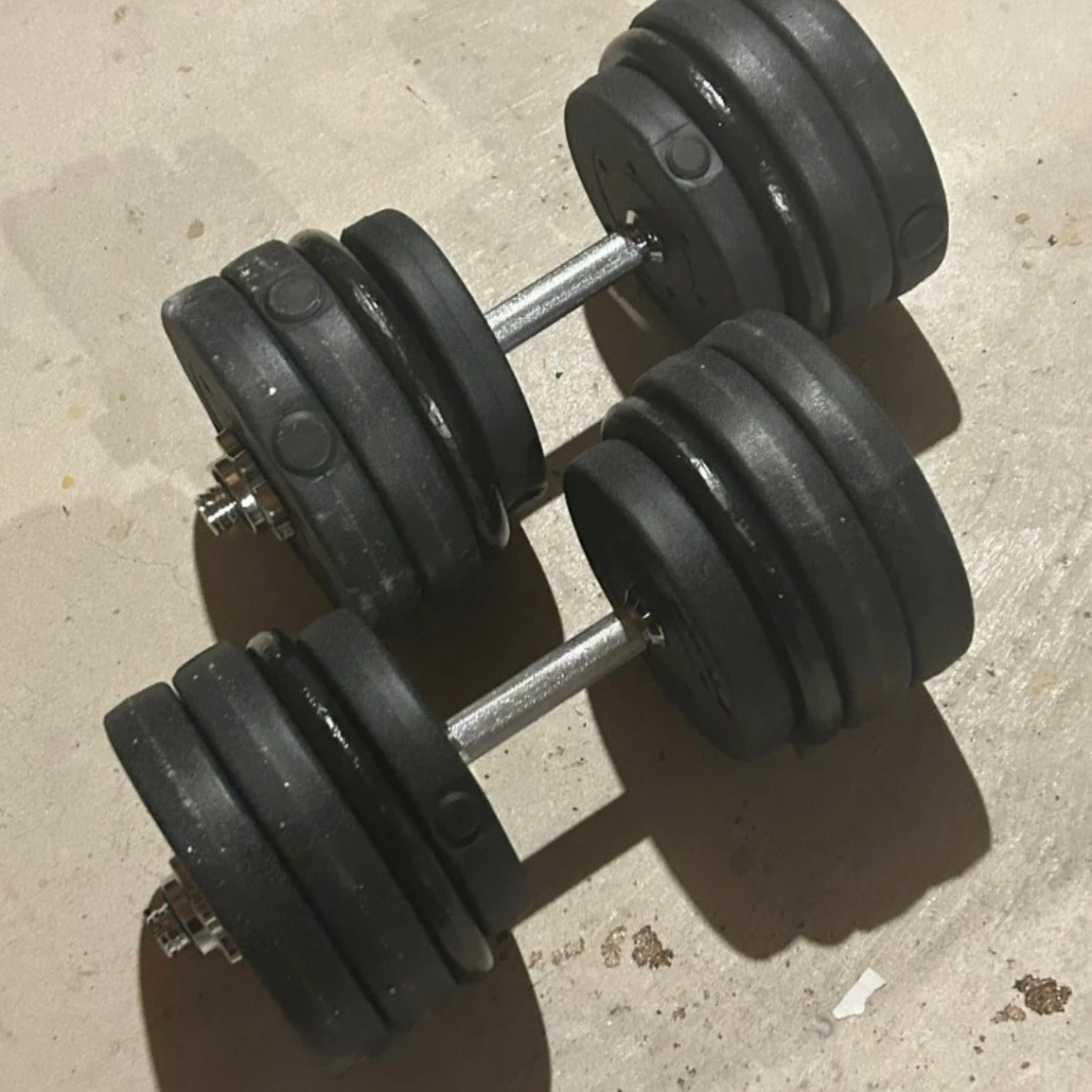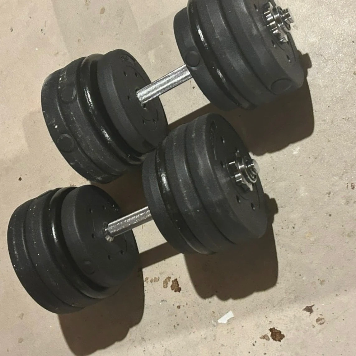 2 dumbbells with adjustable weight plates 97 pounds total 48.5 pounds each