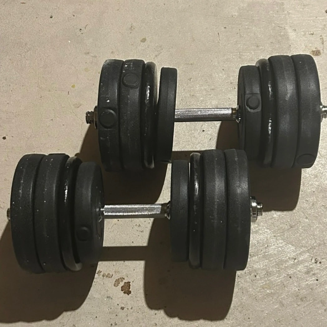 2 dumbbells with adjustable weight plates 97 pounds total 48.5 pounds each