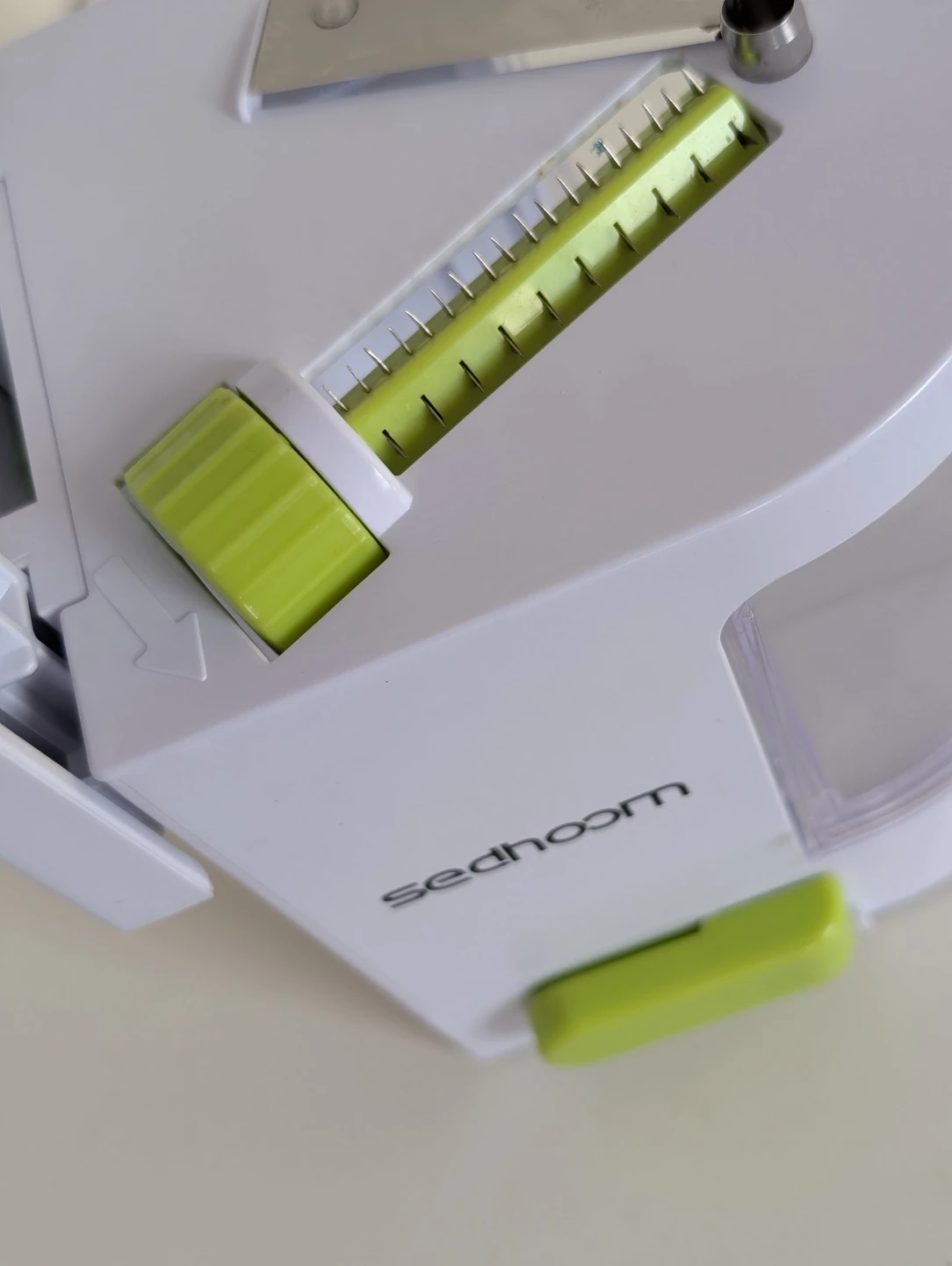This Sedhoom spiralizer turns vegetables into noodles. It's white with green accents and comes with a collection bin. Easy to use for prepping meals
