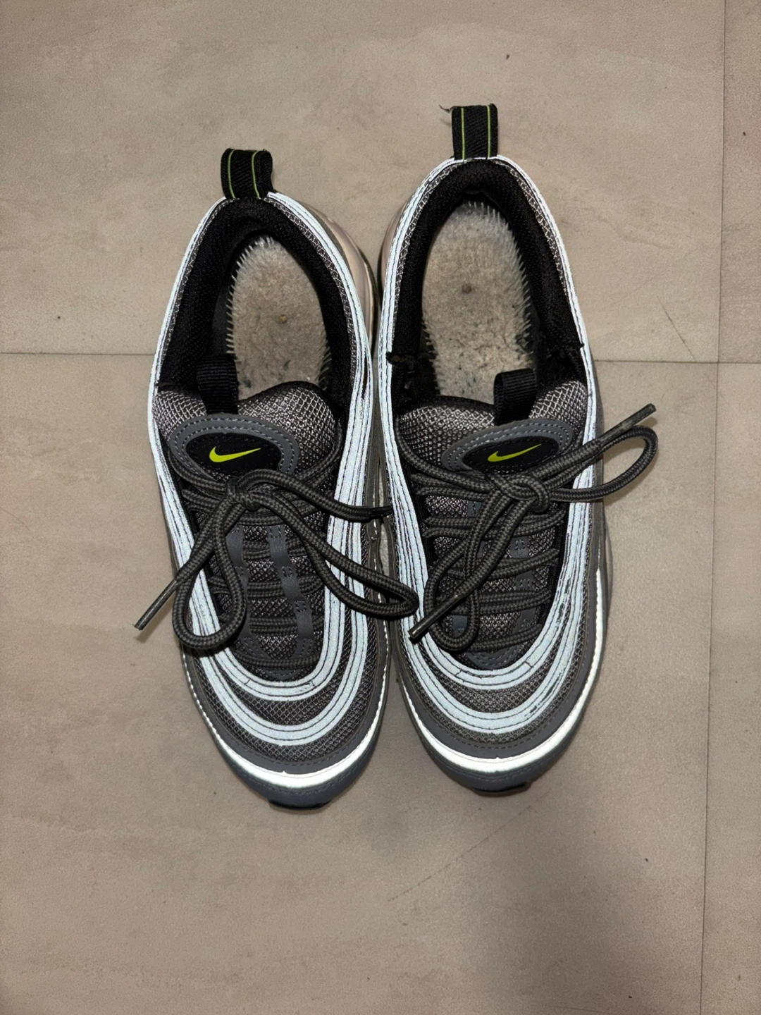 These are Nike Air Max 97 sneakers in the "Volt" colorway. They feature the iconic wavy design lines and visible Air cushioning. Rubber sole for durability. A classic running shoe design. Missing inside soles.