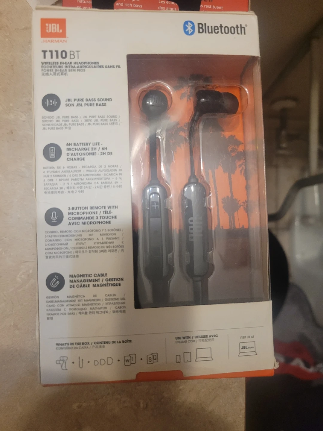These are JBL T110BT wireless in-ear headphones. They offer 6 hours of battery life and feature a 3-button remote with microphone. Magnetic cable management is included.