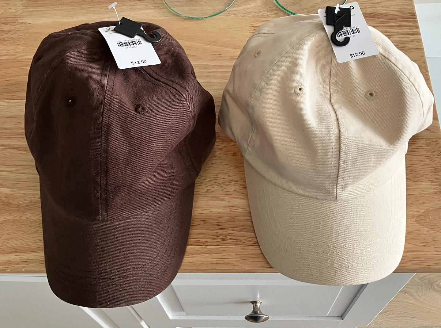 Two baseball caps, one in brown and one in beige. Cotton material. Adjustable strap in back. Os