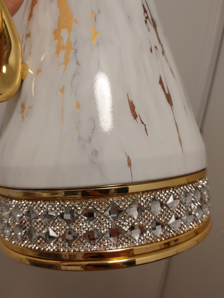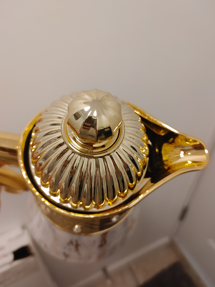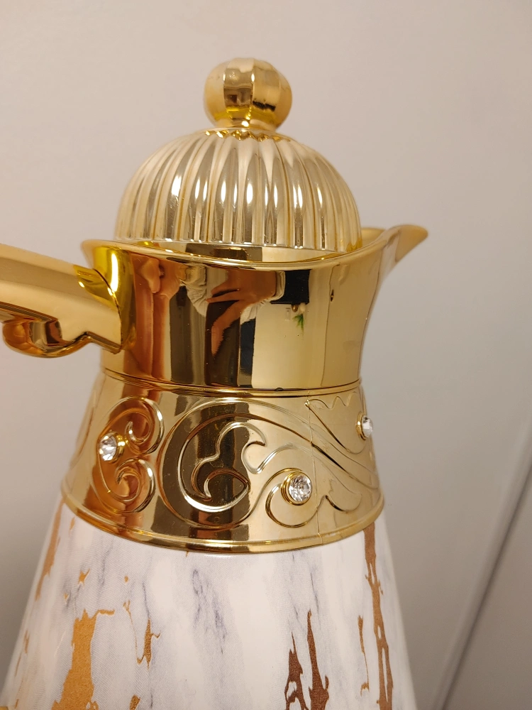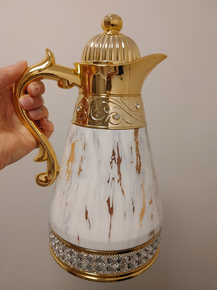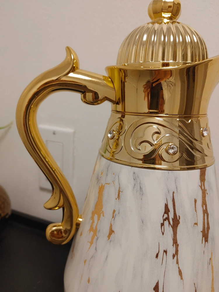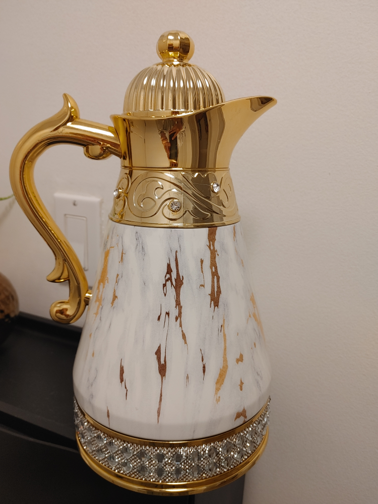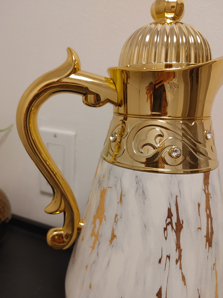 This elegant thermos decanter features a beautiful white and gold marble exterior with ornate gold accents. It's perfect for keeping your beverages hot or cold. The lid fits securely to maintain temperature.