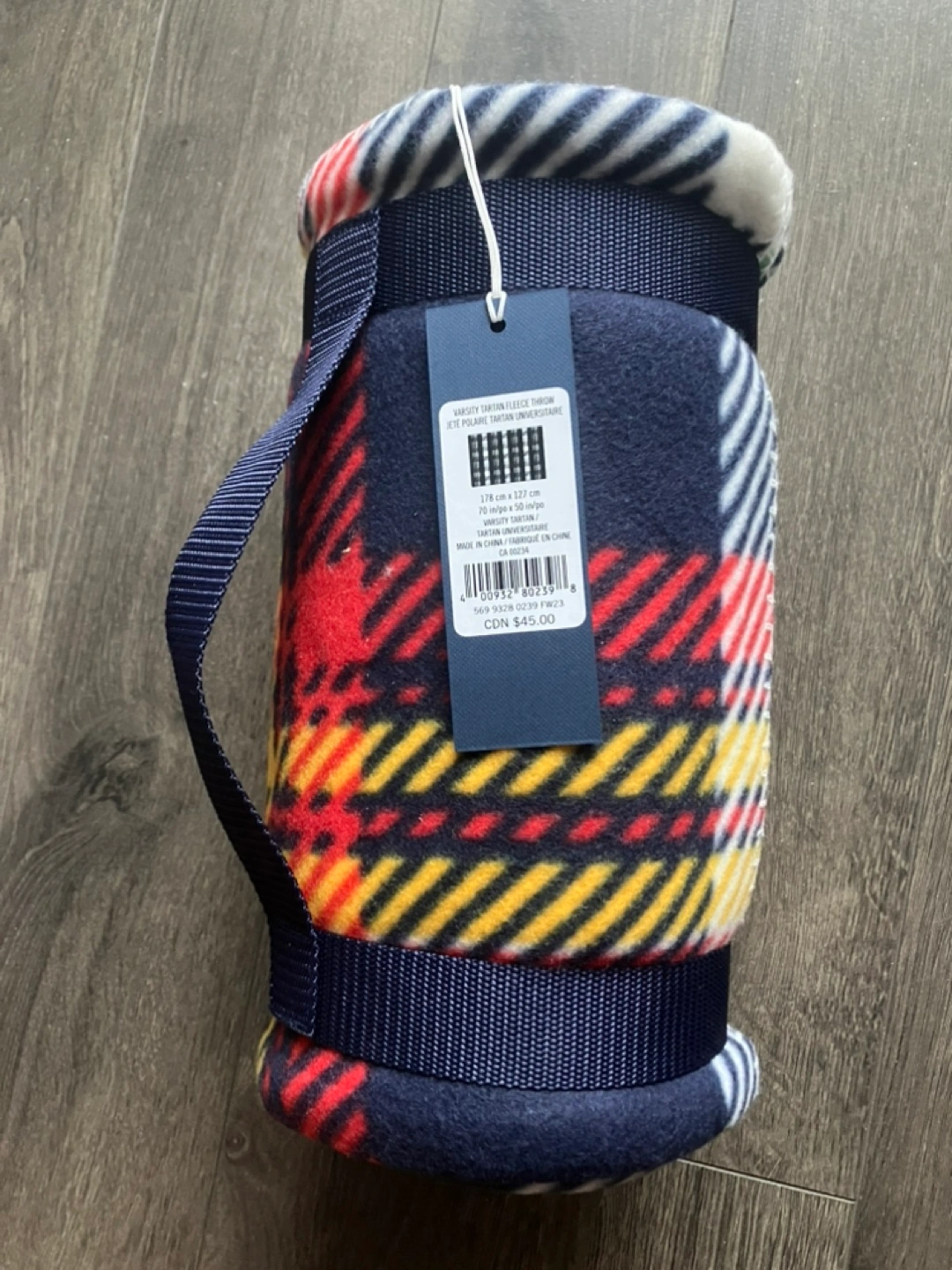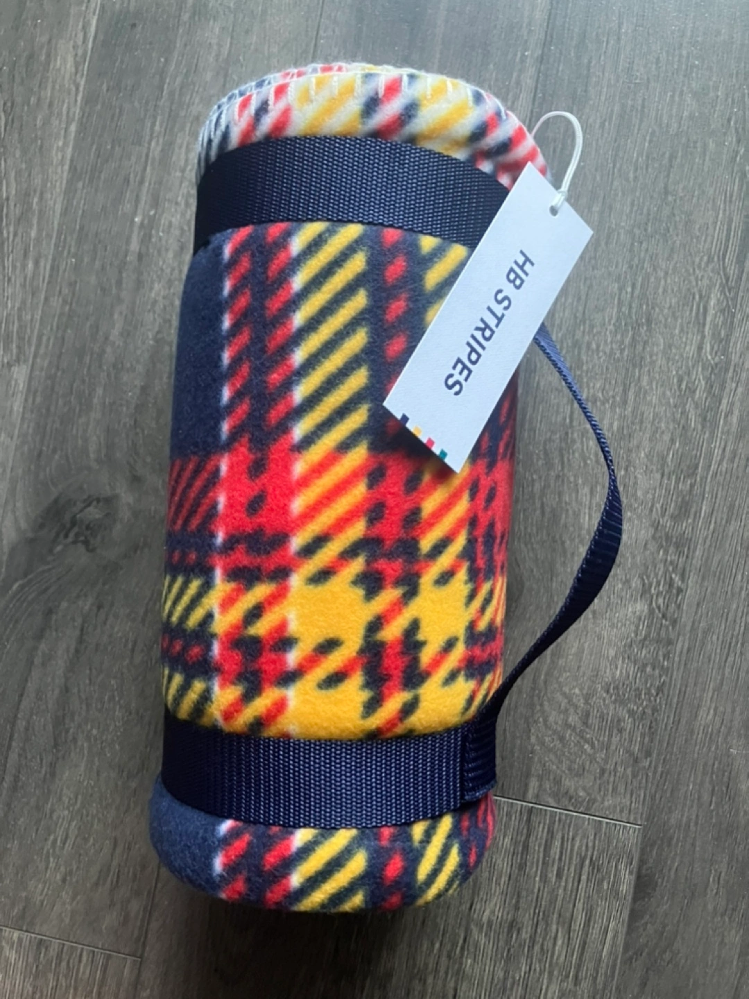 Cozy fleece throw blanket. Features a vibrant plaid pattern in navy, red, and yellow. Rolled and secured with a navy carrying strap. Perfect for travel or everyday use.