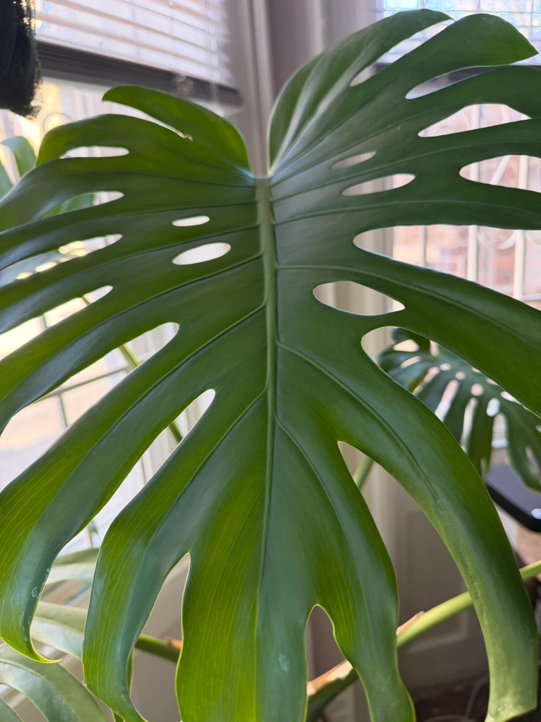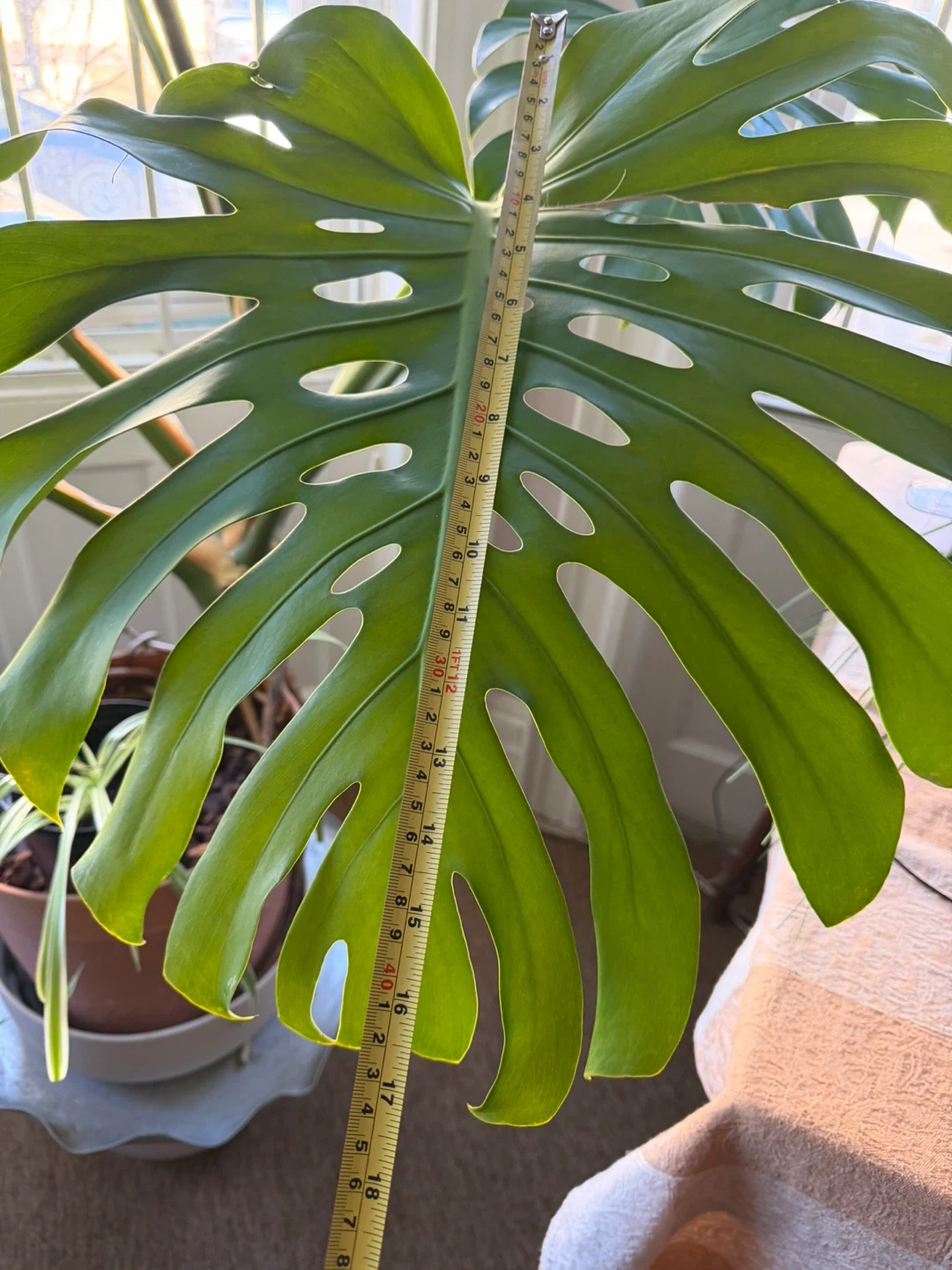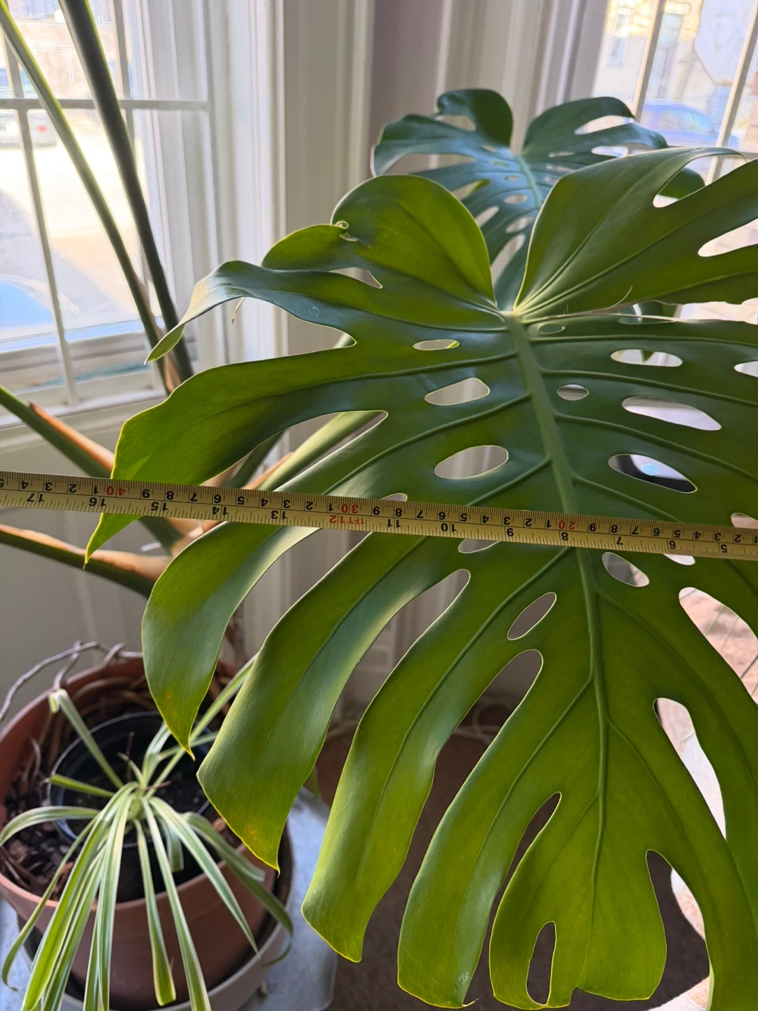 Healthy Monstera Deliciosa plant with large fenestrated leaves. The largest leaf measures approximately 18 inches across. Comes in a terracotta pot with a spider plant as a companion. A beautiful addition to any indoor space!