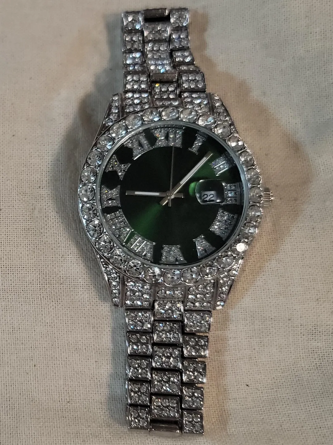 Here's a watch with a green dial and a crystal-covered band and face. It's got a date window at the 3 o'clock position. The watch has Roman numerals for some of the hour markers.