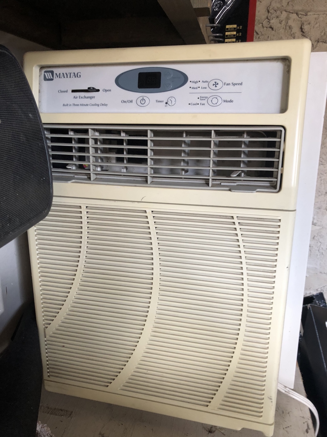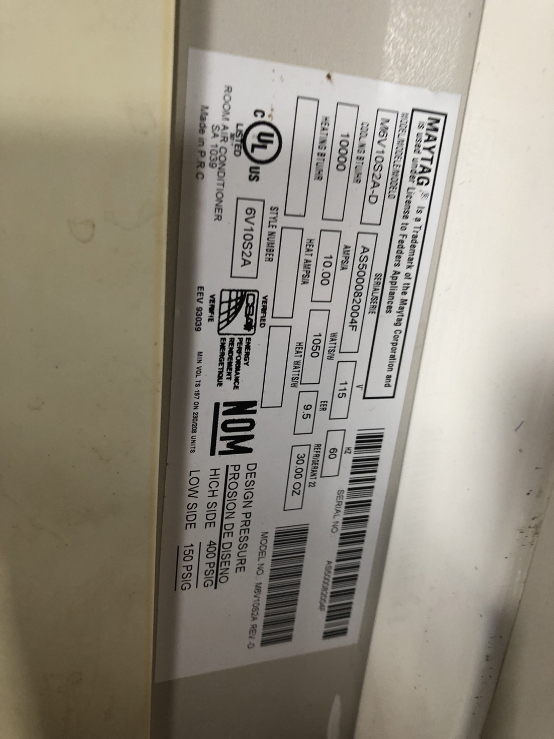 Selling a Maytag room air conditioner. It's a model M6V10S2A-D with 10000 BTU cooling power. It features an air exchanger and three cooling modes. It uses 115 volts and 10.00 amps for cooling and 9.5 amps for heating. Perfect for keeping your room cool and comfortable!