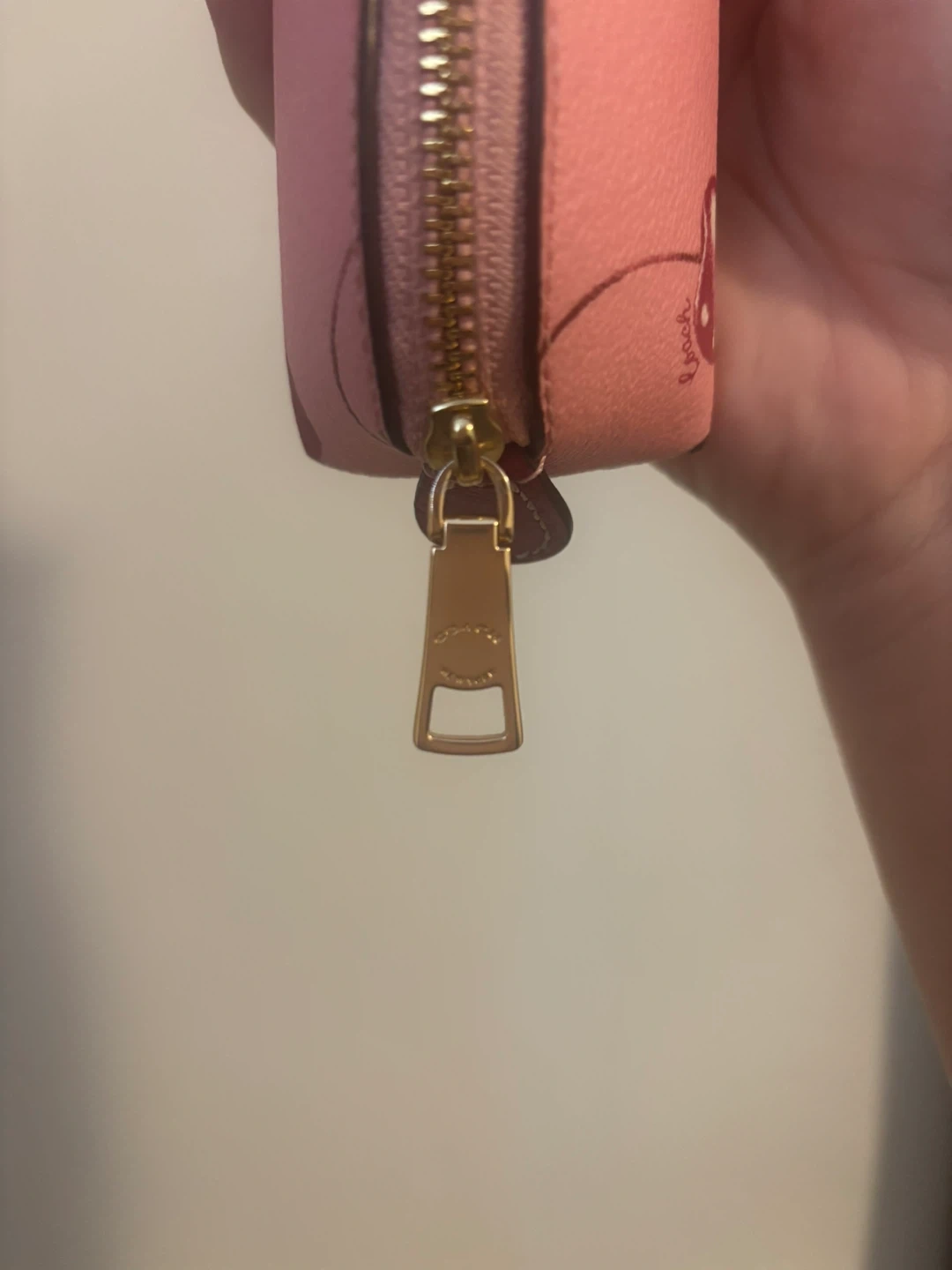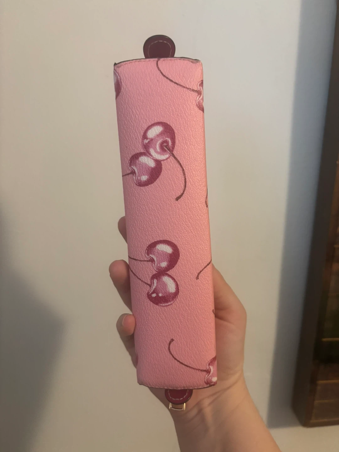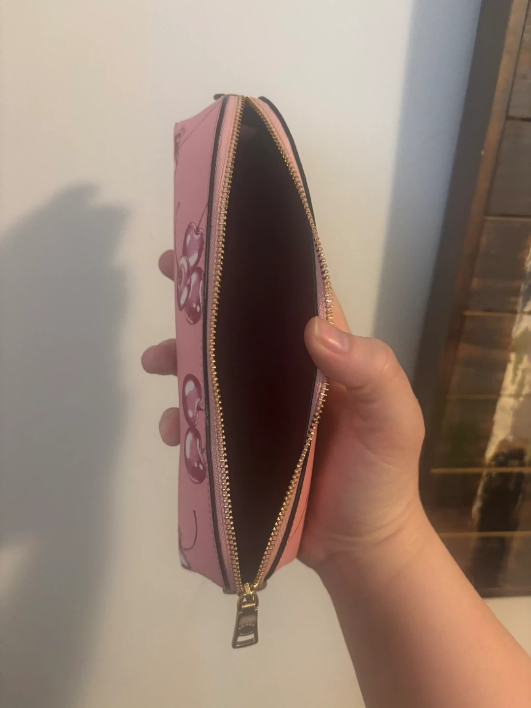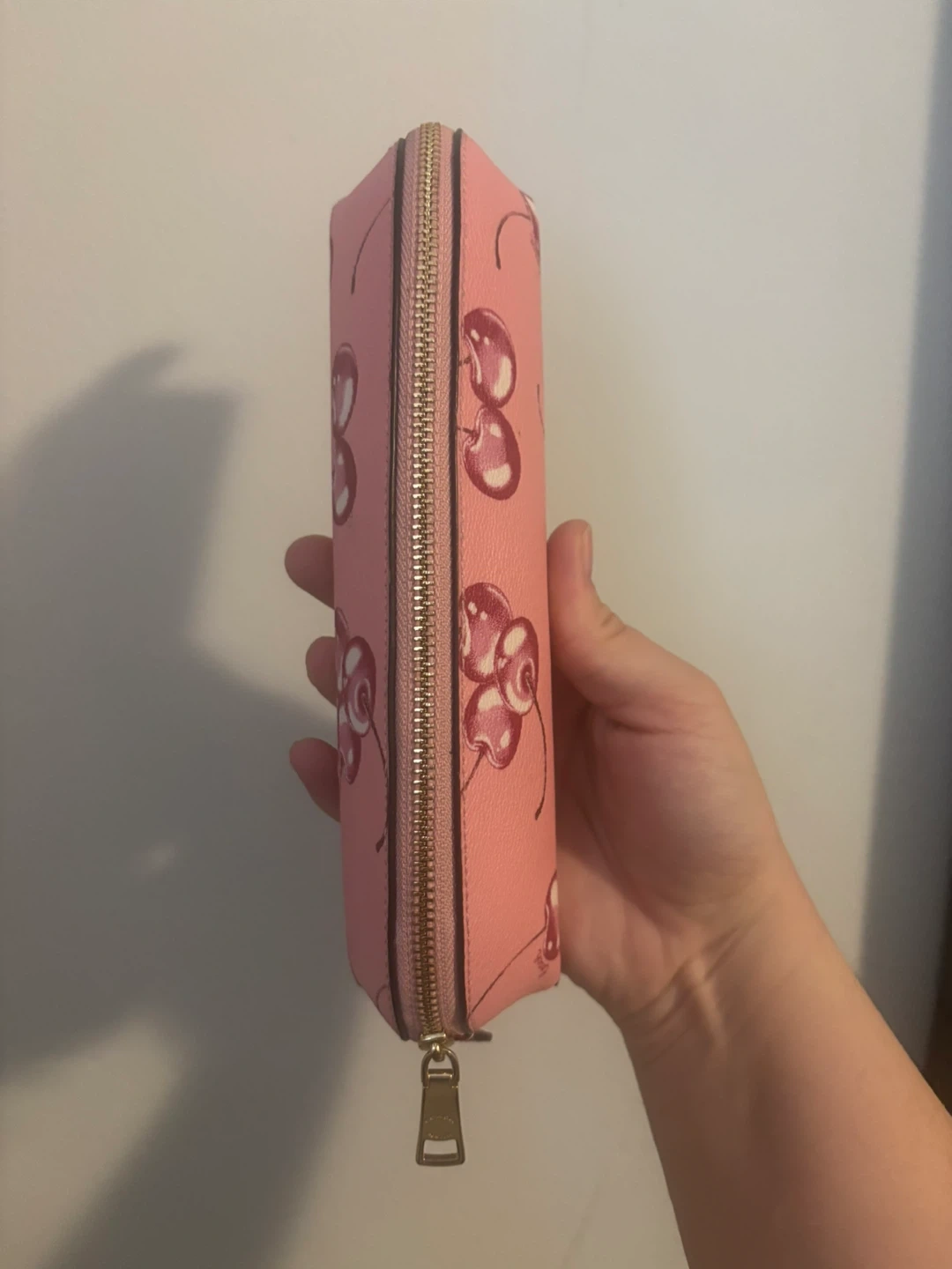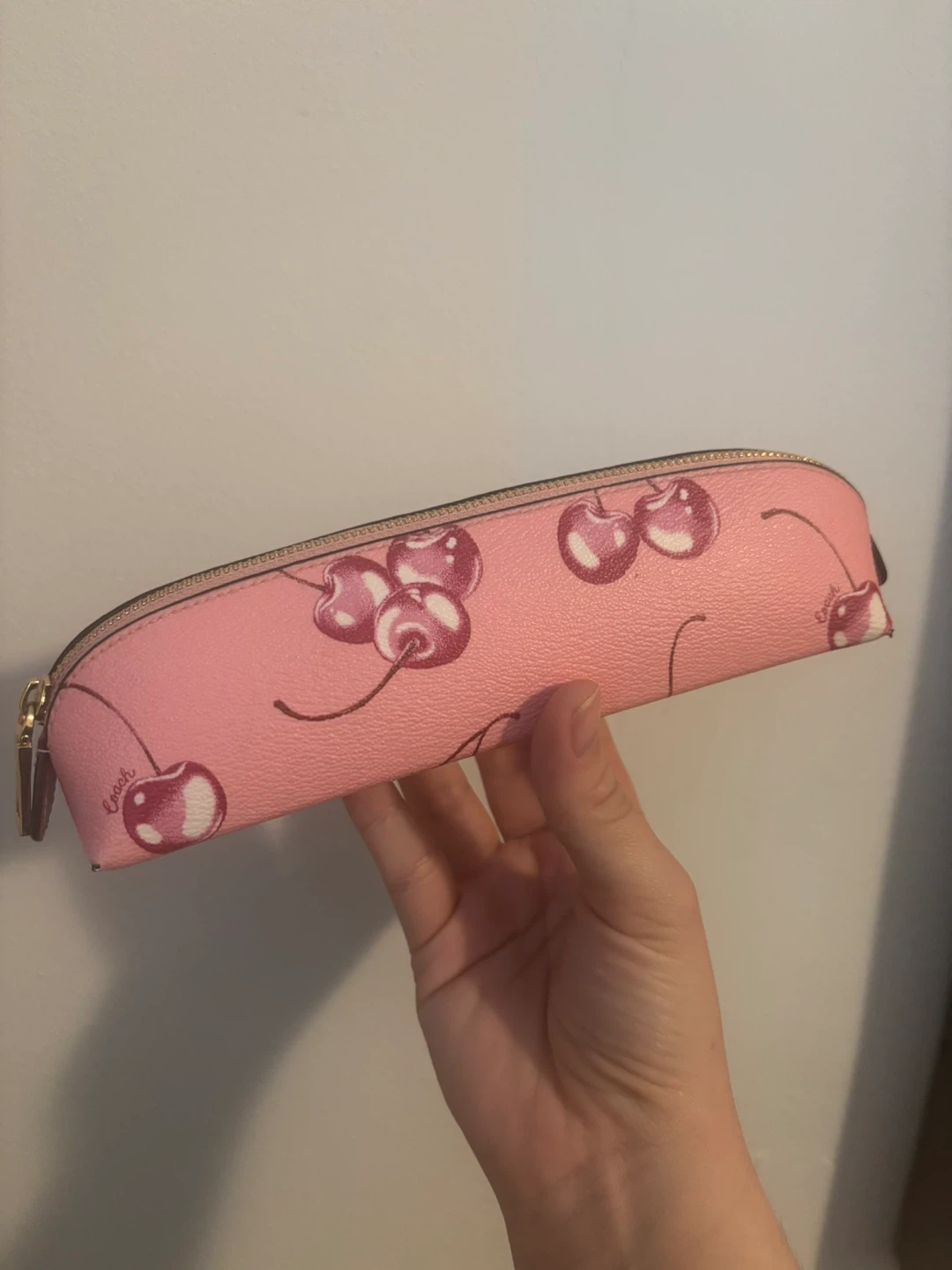 Pink pencil case with a repeating cherry print. It's a great size for pens and pencils. Features a gold-tone zipper closure.