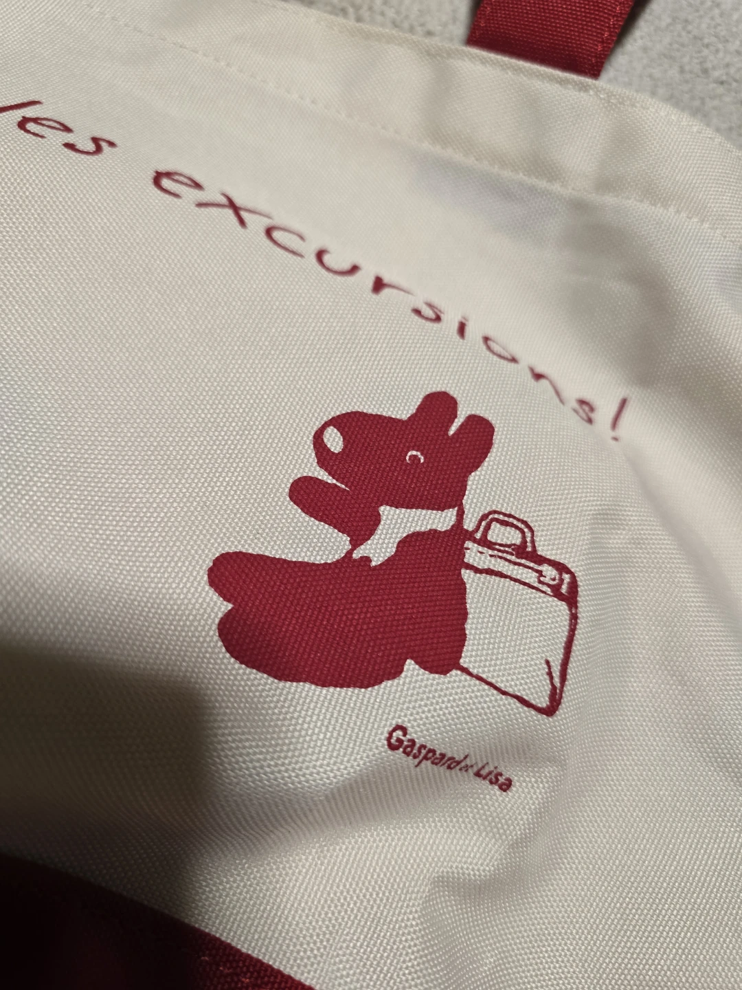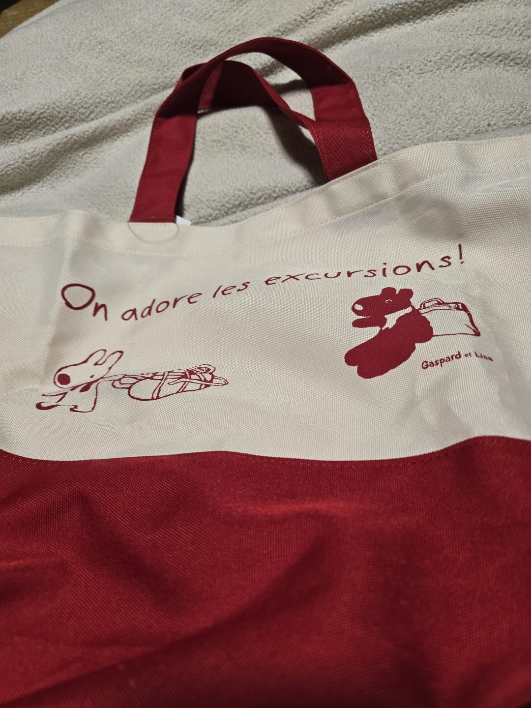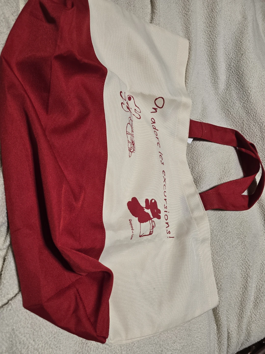 This red and cream canvas tote bag features cute Gaspard et Lisa characters and the phrase 'On adore les excursions!'. It's perfect for carrying your essentials on an outing. Made of durable polyester canvas like material.