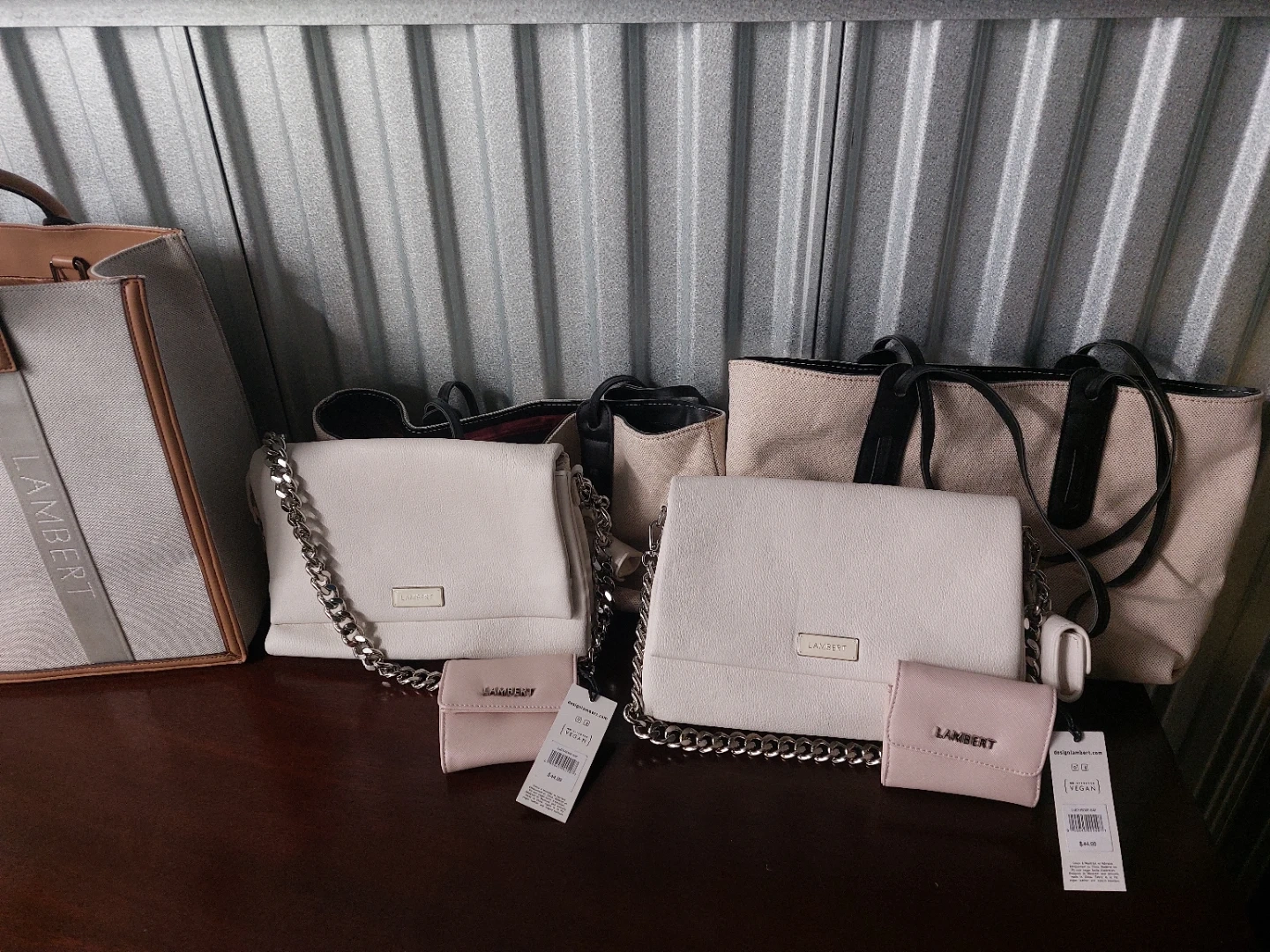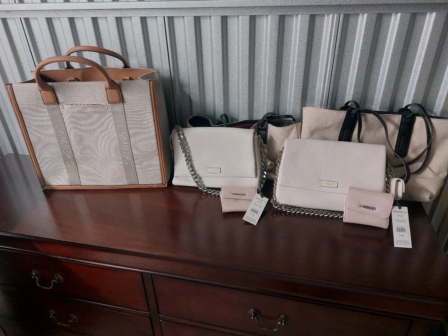 This Lambert tote bag is a stylish and practical accessory. It's made from durable canvas with vegan leather trim. Includes a matching wallet for your essentials. Perfect for everyday use! IF SOMEONE WANTS ALL IN THE PICTURES I CAN DO GOOD DEAL IF ONE PERSON TAKE ALL $120 OR TAKE OFFER