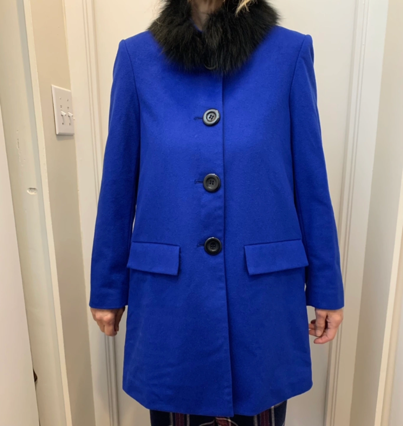 A beautiful blue wool coat with a real fur collar! This coat is in great condition and would be perfect for the colder months.