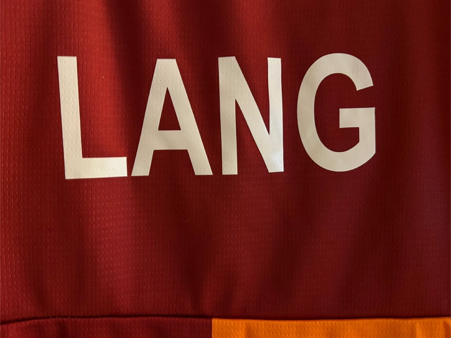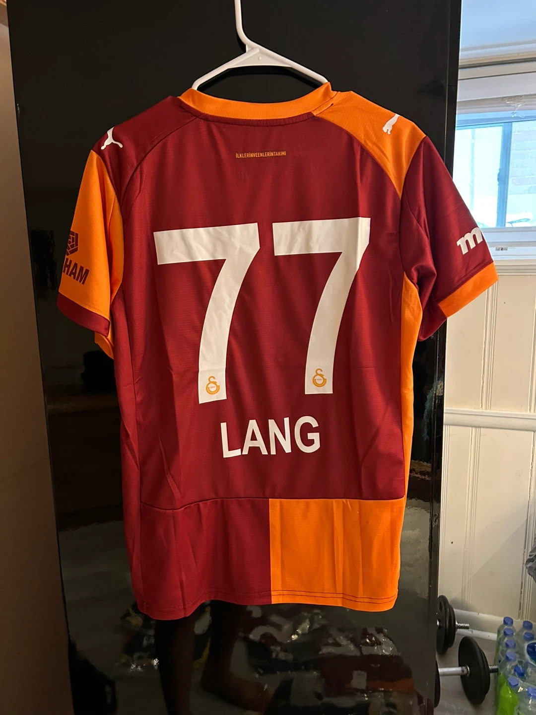 This is a Puma Galatasaray soccer jersey with "Lang 77" on the back. It features the team's iconic orange and maroon split design. DryCELL technology is integrated for moisture-wicking.