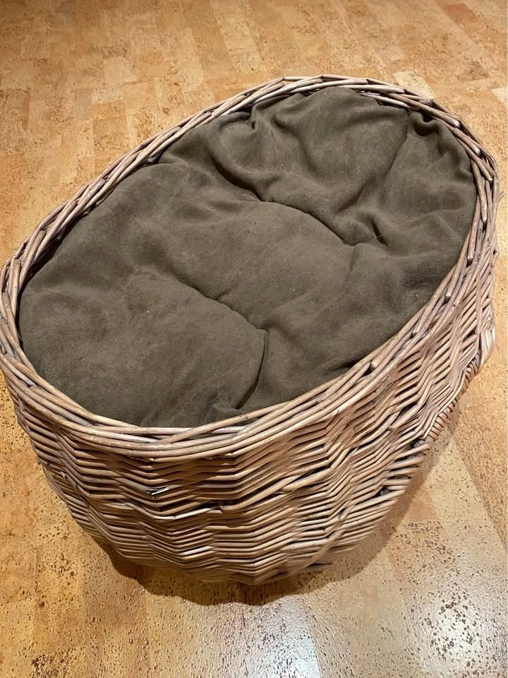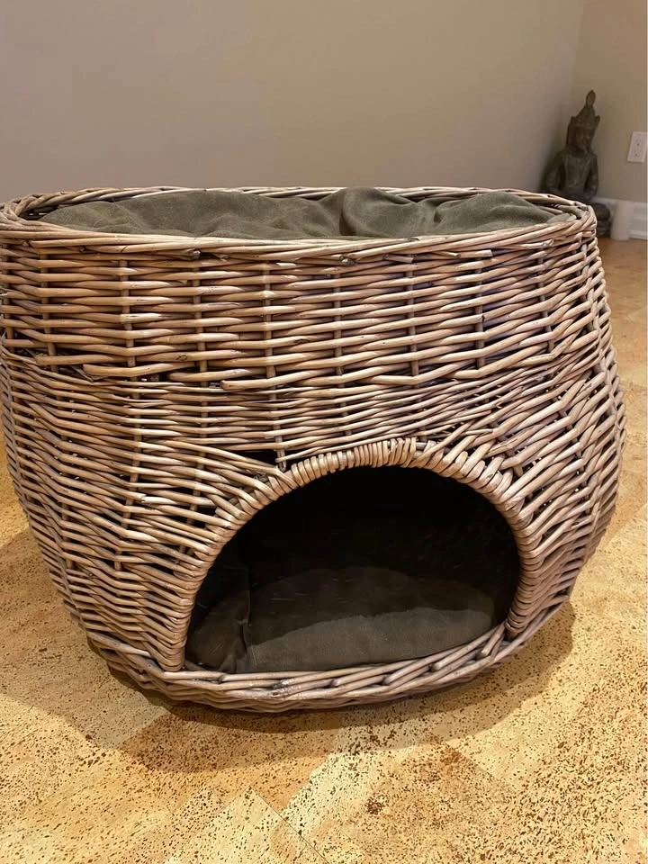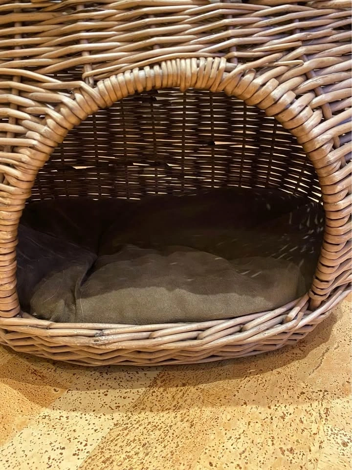 Wicker cave with cushion and top level also cushioned. The cushions are removable for easy cleaning and have two different colours on each side. Very sturdy, well made wicker: 56 cm wide x 40 cm deep and 47 cm high.