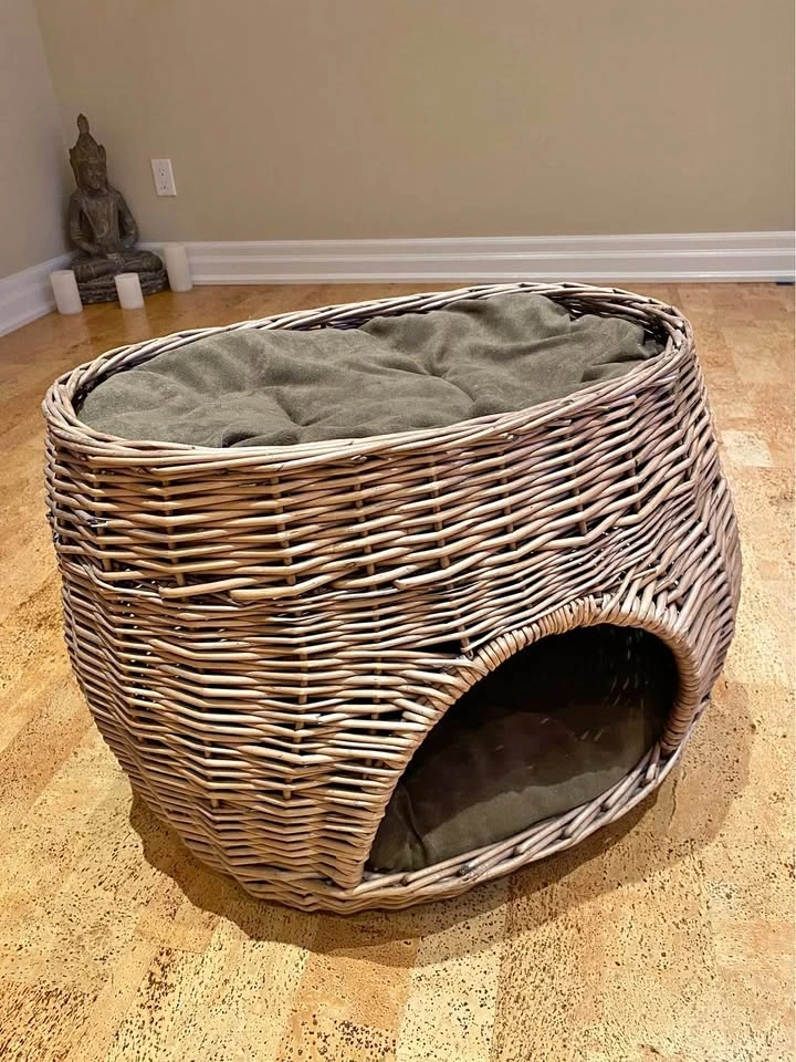 Wicker cave with cushion and top level also cushioned. The cushions are removable for easy cleaning and have two different colours on each side. Very sturdy, well made wicker: 56 cm wide x 40 cm deep and 47 cm high.