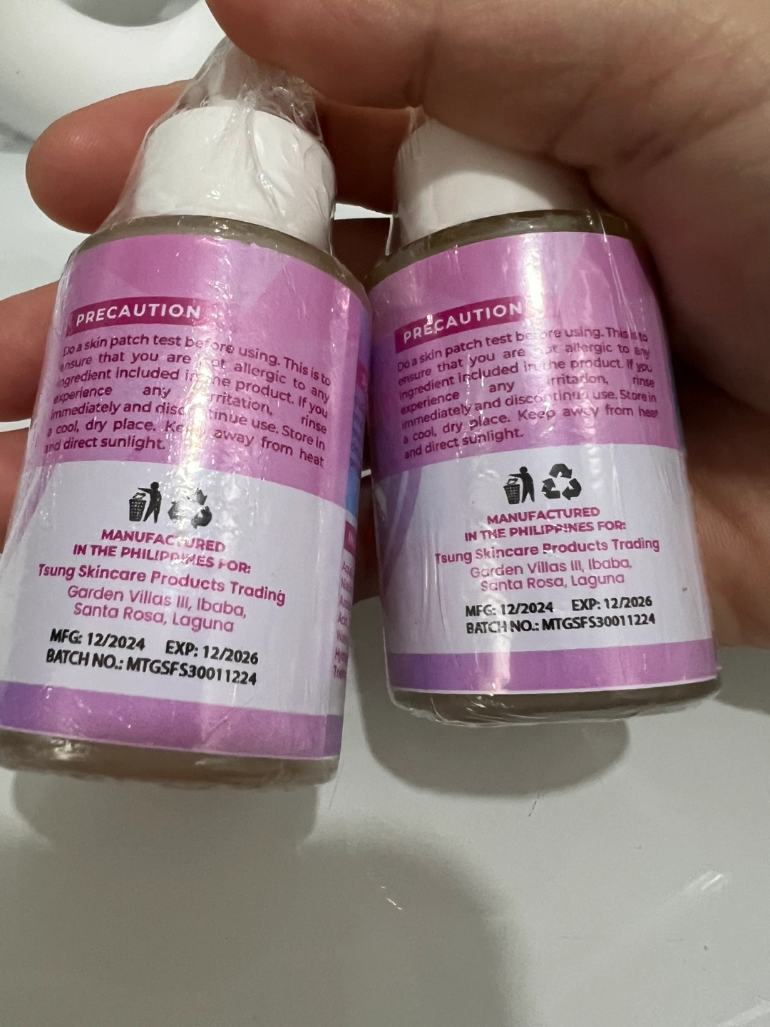 Two unopened bottles of Ms. JIsung Essentials Glass Skin Facial Serum. Each bottle contains 30ml. Niacinamide, Glycolic Acid, and Kojic Acid ingredients listed. Manufactured in the Philippines. Expiry date: 12/2026.