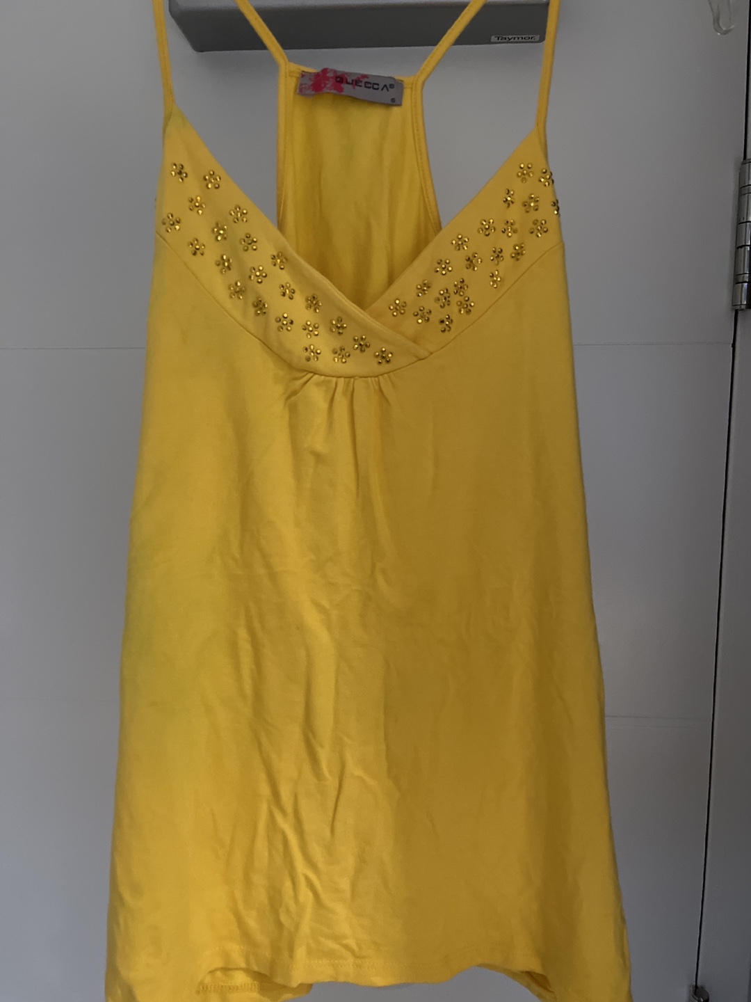 Here's a cute yellow tank top by Quecca! It features a racerback style and some lovely beaded detailing around the neckline. It's in great condition and ready for a new home!