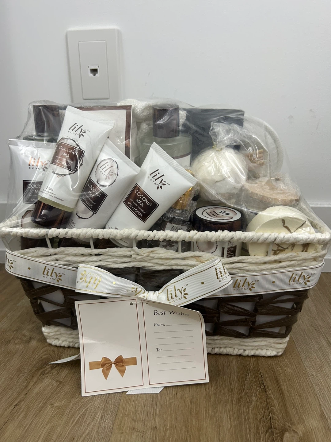 A complete Lily Home bath and body gift basket featuring coconut milk scented products. Includes body lotion, shower gel, bath salt, and more. This relaxing set is perfect for unwinding after a long day.