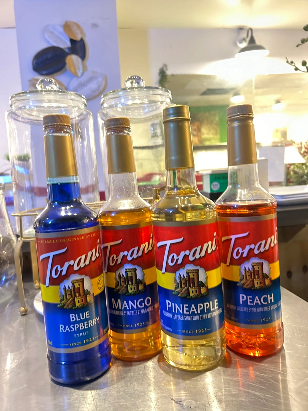 Four bottles of Torani flavored syrups. Flavours include blue raspberry, mango, pineapple, and peach. Excellent for coffee, cocktails, and baking.