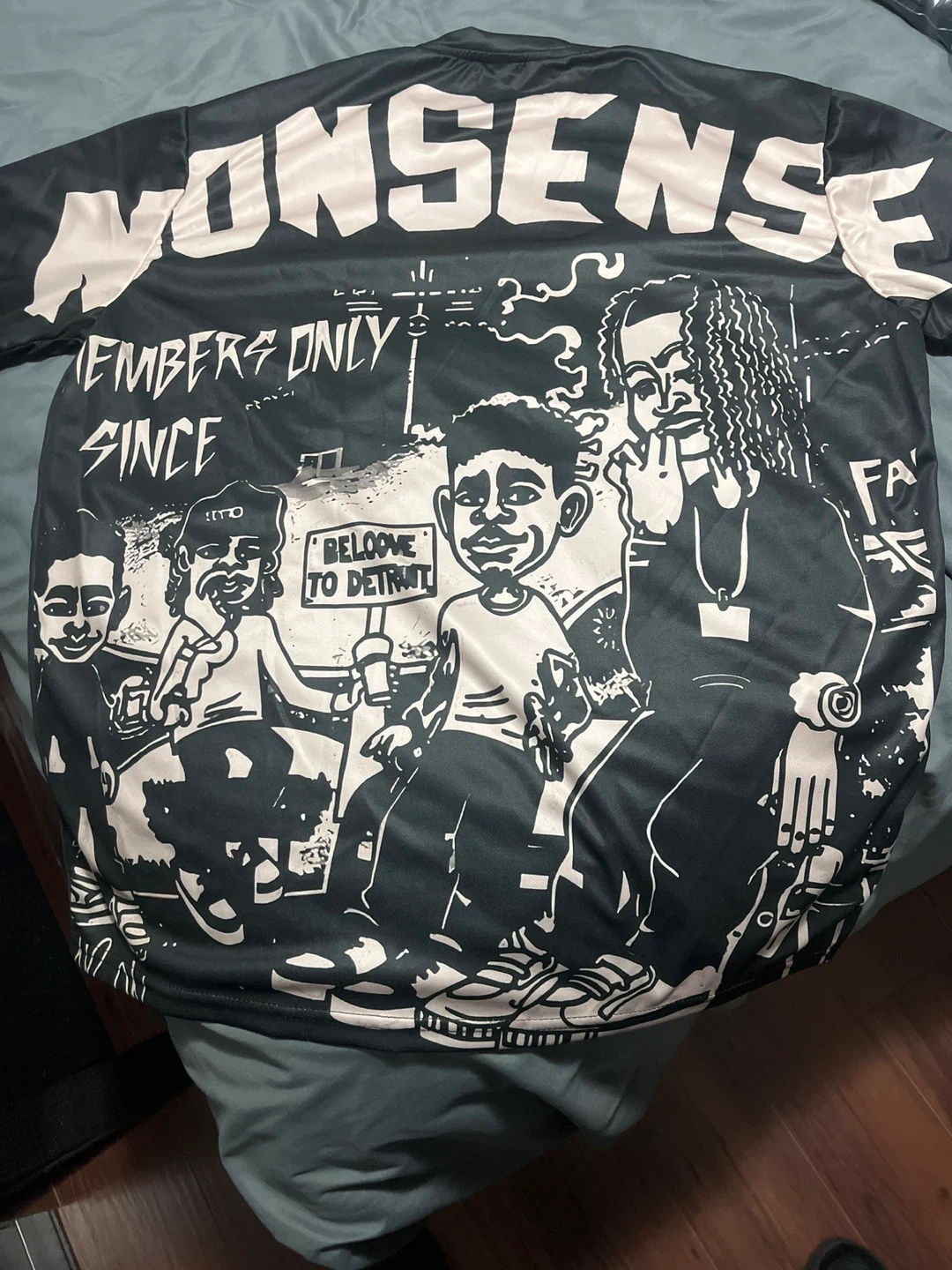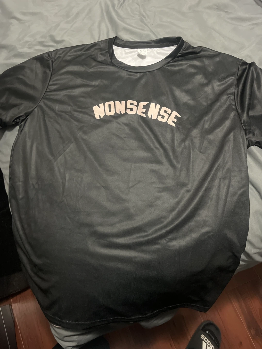 Black NONSENSE graphic t-shirt with a large print on the back. Shirt is black with 'NONSENSE' in pink lettering on the front. It's made of a smooth, synthetic material.