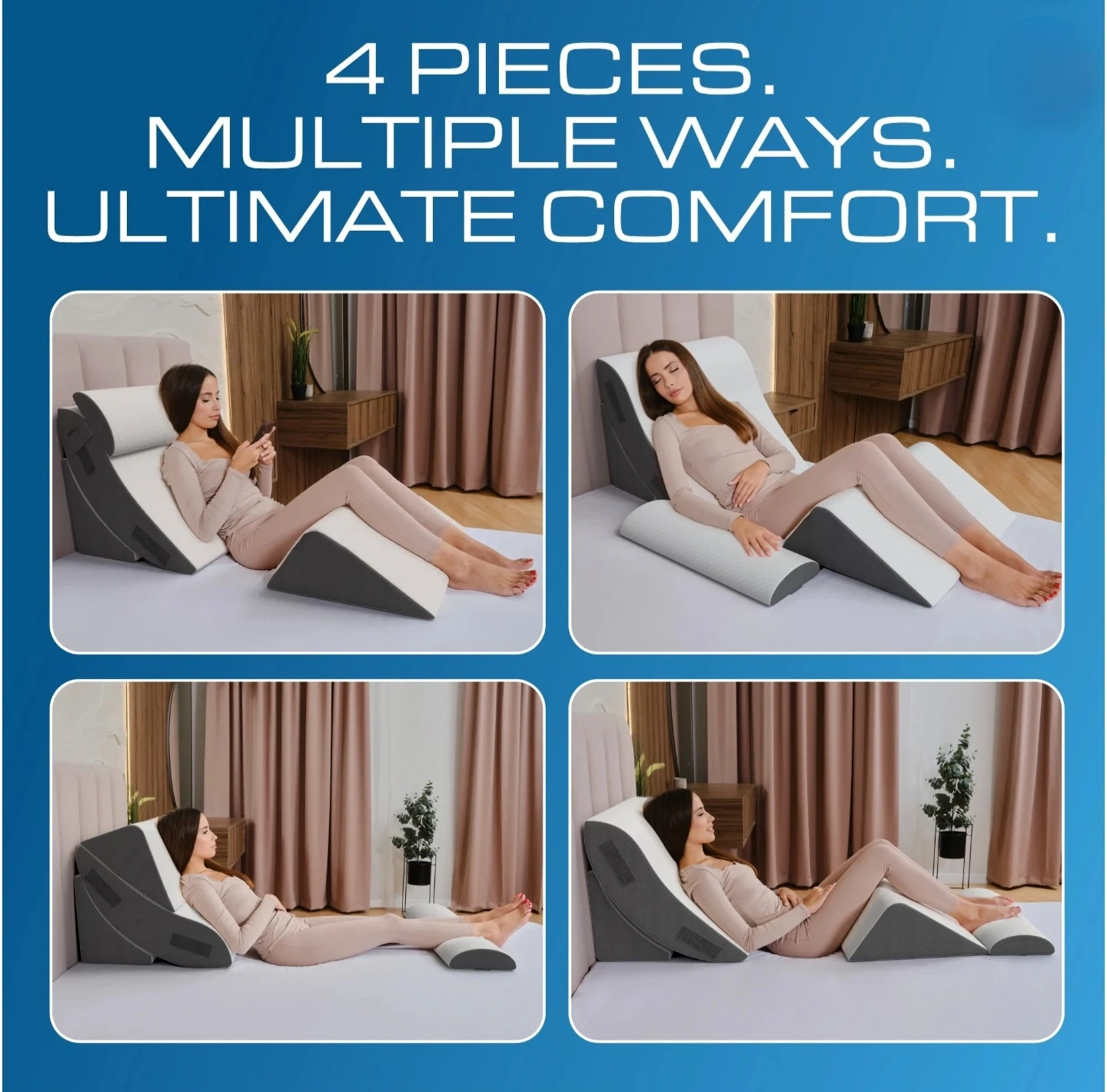 MULTIFUNCTIONAL WEDGE PILLOW: KINGFUN surgery pillow consists of four parts that can be combined. Choose a proper angle for sitting up, lying down and sleeping on the adjustable back pillows. Leg elevation pillow can relieve discomfort and pressure on the legs and knees. The elongated foam wedge pillow can be used to support the head or as an arm pillow.