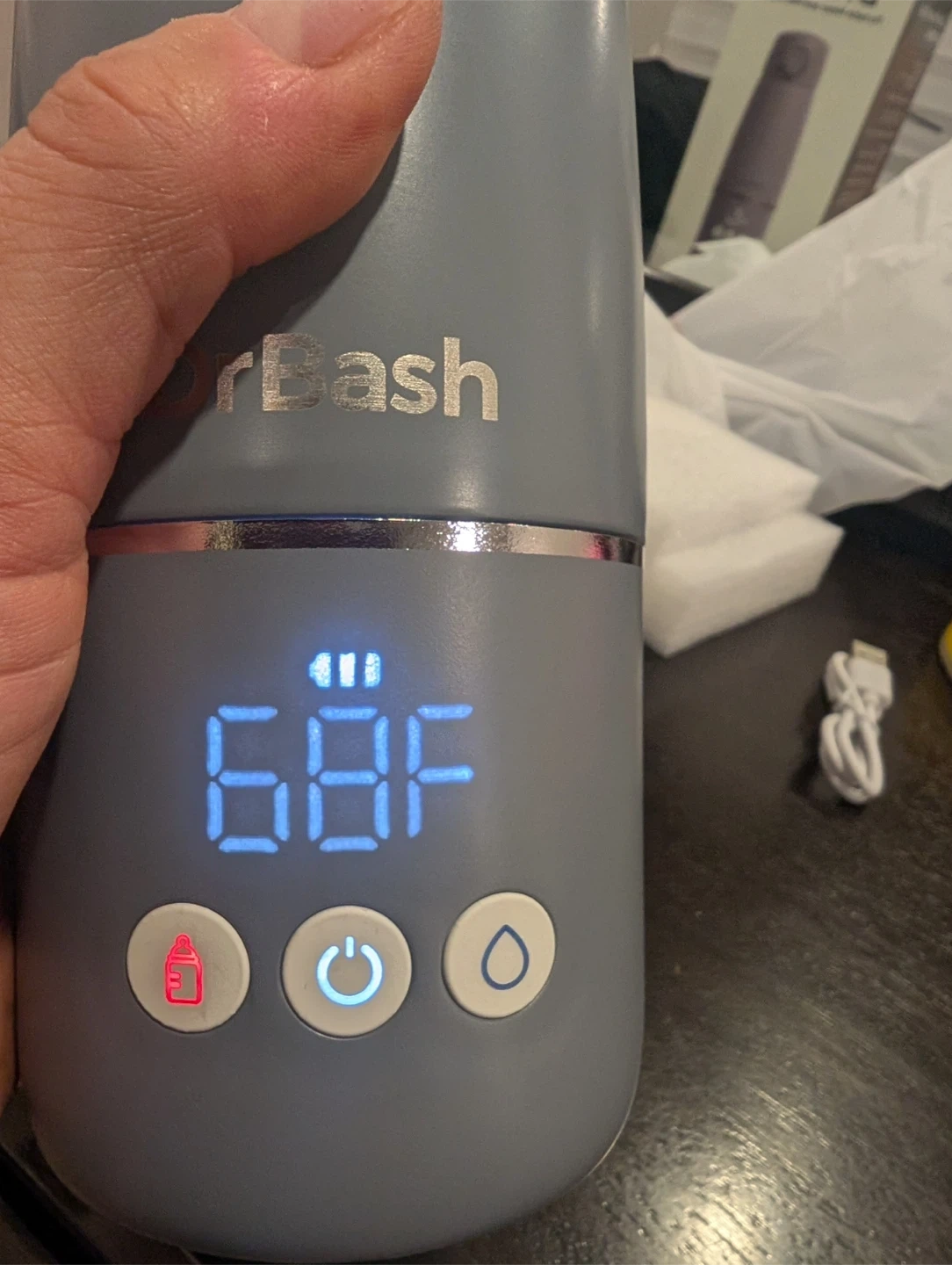 This is a Dr. Bash portable water and milk heater. It displays temperature in Fahrenheit and has multiple settings. Includes USB charging cable. Brand new
