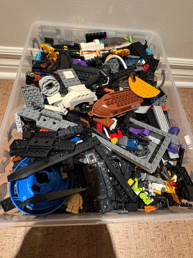 This bin contains a large quantity of Lego pieces, ready to fuel your next building adventure! I believe the Legos are mostly black, grey and white pieces. This is a used collection, perfect for expanding your Lego collection or starting a new one. Selling it as is.