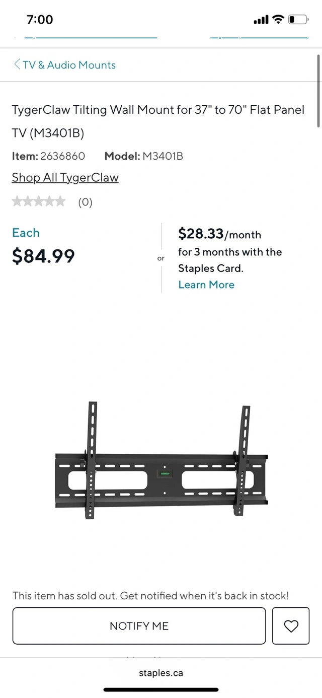 This TygerClaw tilting wall mount is designed for 37" to 70" flat panel TVs. It's in used condition, but fully functional and ready to securely hold your television. All hardware included. 3 available Specifications: * Brand: TygerClaw * Model: M3401B * Suitable for: 37" - 70" Flat Panel TVs * Type: Tilting Wall TygerClaw M3401B give your TV the perfect spot in the wall with this Tilting Wall Mount. This mount is constructed with cold steel material to maximize the durability and support, this wall mount can tilt your screen so you'll always can find the perfect viewing angle. This mount was built to give options for TV from 37 in. to 70 in. with weighing up to 165 lb. and also an innovative locking mechanism gives quick and easy installation. This mount is the best solution for mounting TV on the wall without any hesitation. Holds most 37 in. to 70 in. flat panel TV up to 165 lb. Tilt degree from -10 to 0 Universal mounting pattern up to 810 x 410mm Constructed with cold steel material to maximize the durability and support VESA Compliant, RoHS Compliant All necessary mounting hardware is included Quick and easy installation Looking for a reliable way to mount your TV? This could be it! Please note, if the ad is up, it's still available for purchase.