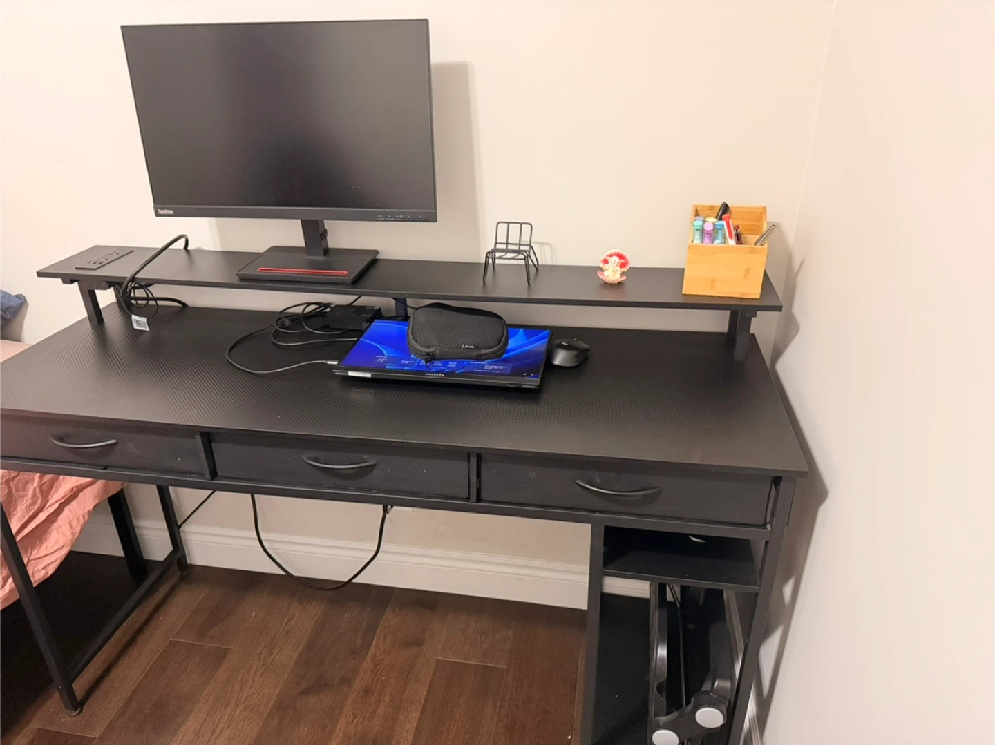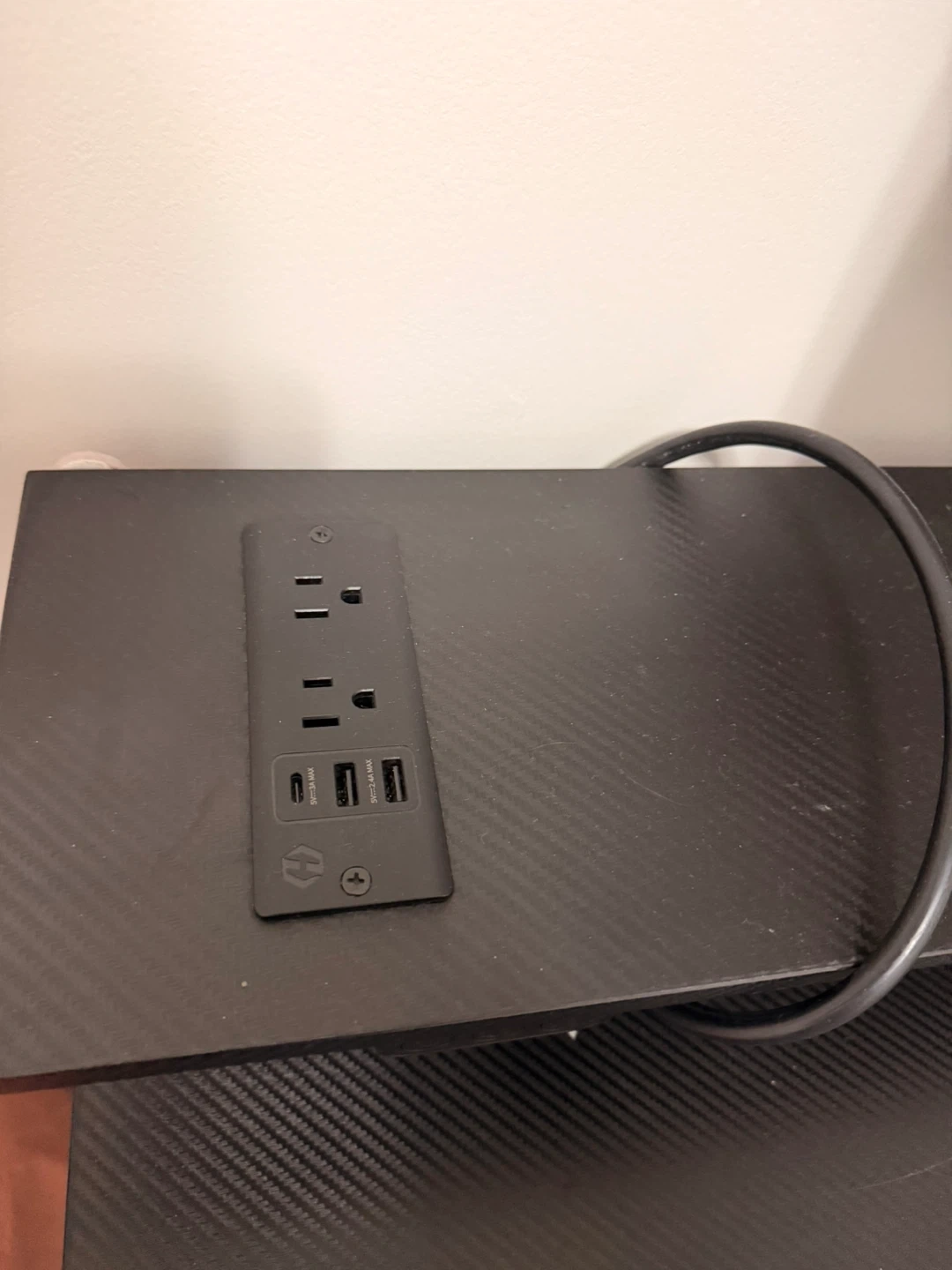 This desk has a built-in power outlet with two USB-A and one USB-C port. It's a handy addition to keep your devices charged and ready to go. The outlet is integrated into the desk surface for a clean look.