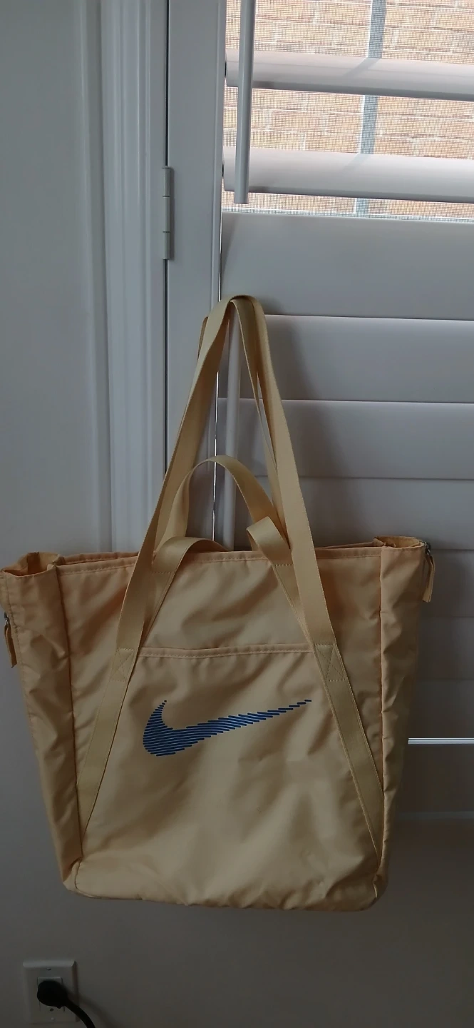 A practical yellow tote bag from Nike. It's made of durable material and features the iconic Nike swoosh. This bag is great for everyday use or for carrying gym gear.