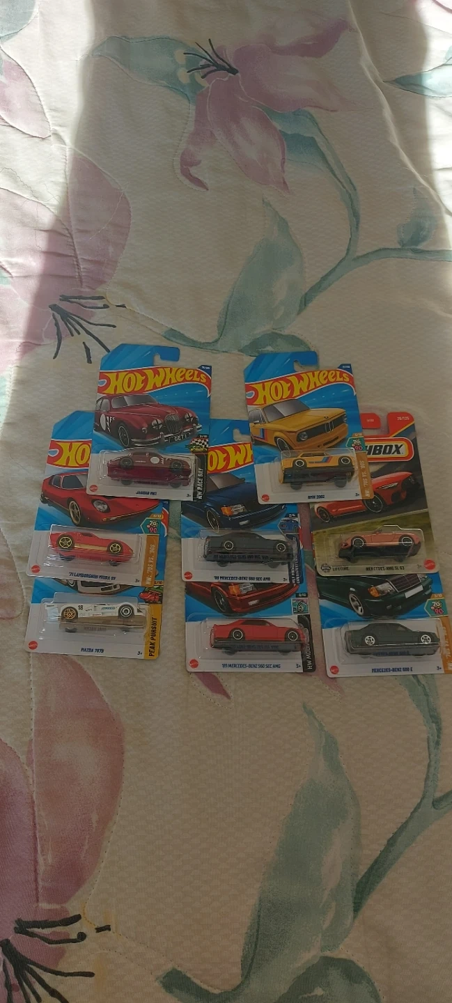Bundle of assorted Hot Wheels and Matchbox toy cars. Includes models like the '71 Lamborghini Miura SV, Mazda 7079, BMW 2002, and various Mercedes-Benz models. Great for collectors and kids!