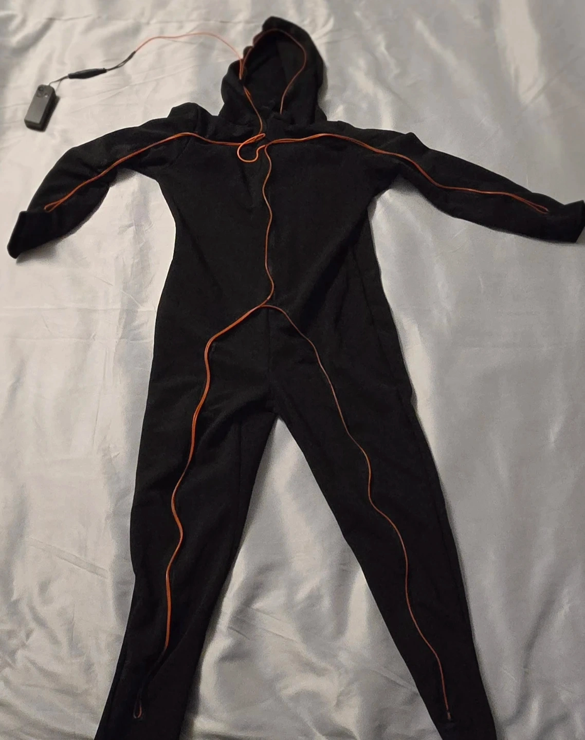 Selling a Spirit Halloween light-up stick figure costume! This costume is a child's size medium (8-10). It includes the light-up jumpsuit, mesh face cover, battery pack and gloves that were never used. The costume features three light settings: solid, multi-speed, and flashing. Perfect for Halloween or any dress up occasion!