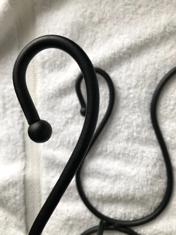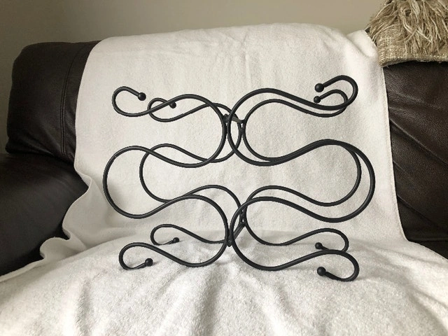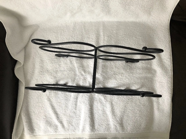 Compact black metal freestanding wine/bottle rack. Easily fits on counters, tables, in cabinets, or on top of the fridge. Holds 7 bottles. Bottles in picture not included. Dimensions: 14”W x 10”H x 5” Depth. Pickup in Brampton, near Queen and Kennedy.