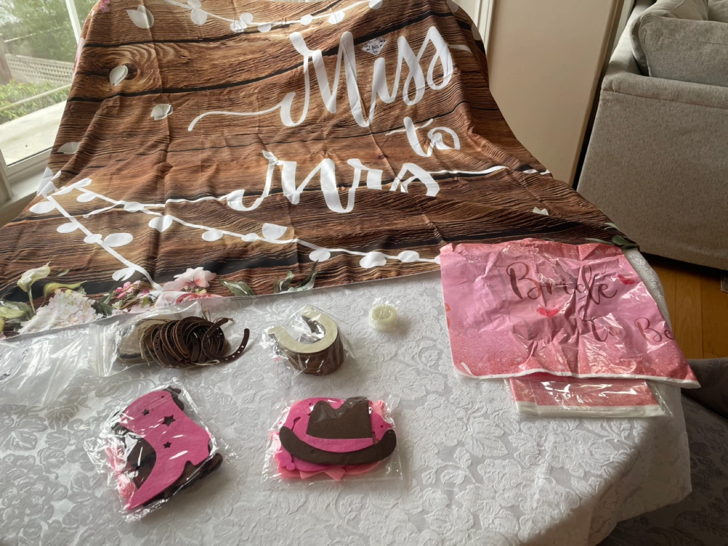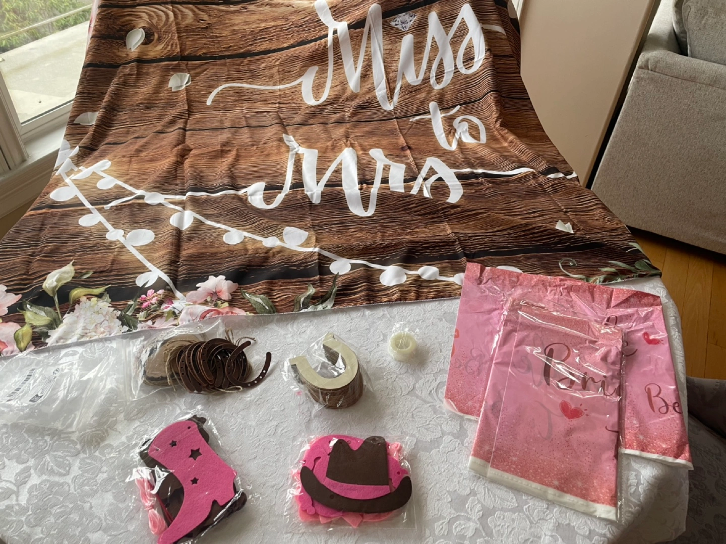 Adorable rustic bridal shower decorations. Includes extra large cloth backdrop, pink and brown themed decorations, and other party supplies. Perfect for a western-themed bridal shower.