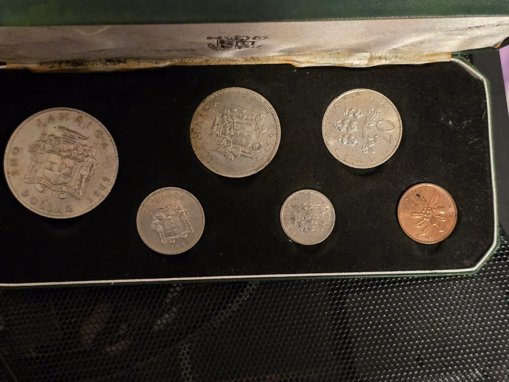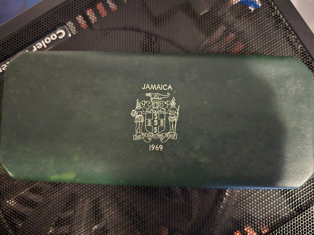 Vintage Jamaica coin set. Six coins in a green leatherette case. Dates from 1969. Great for collectors.