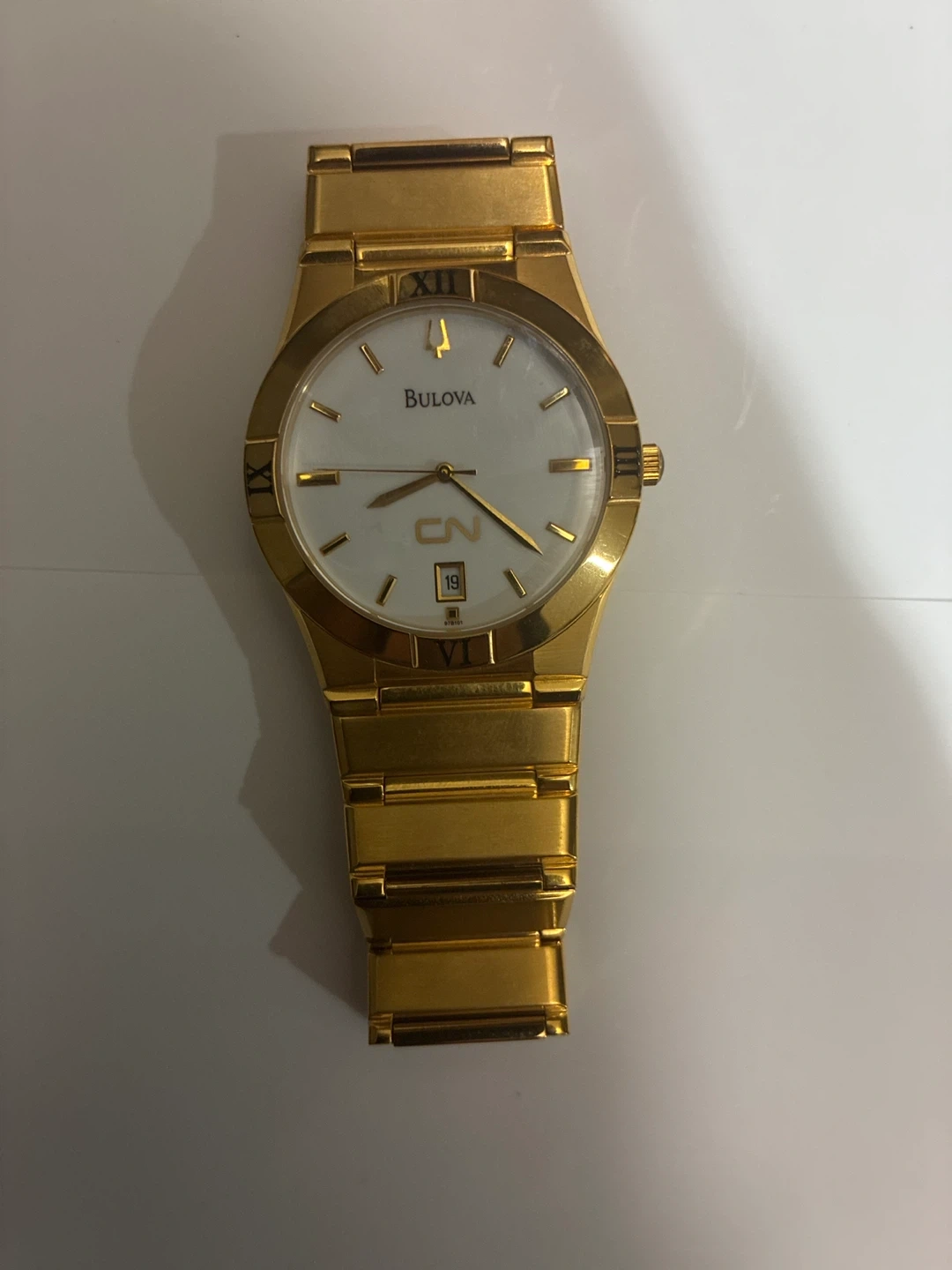 A classic gold-tone Bulova watch. It features a white dial with Roman numerals and a date window. The "CN" logo is prominently displayed.