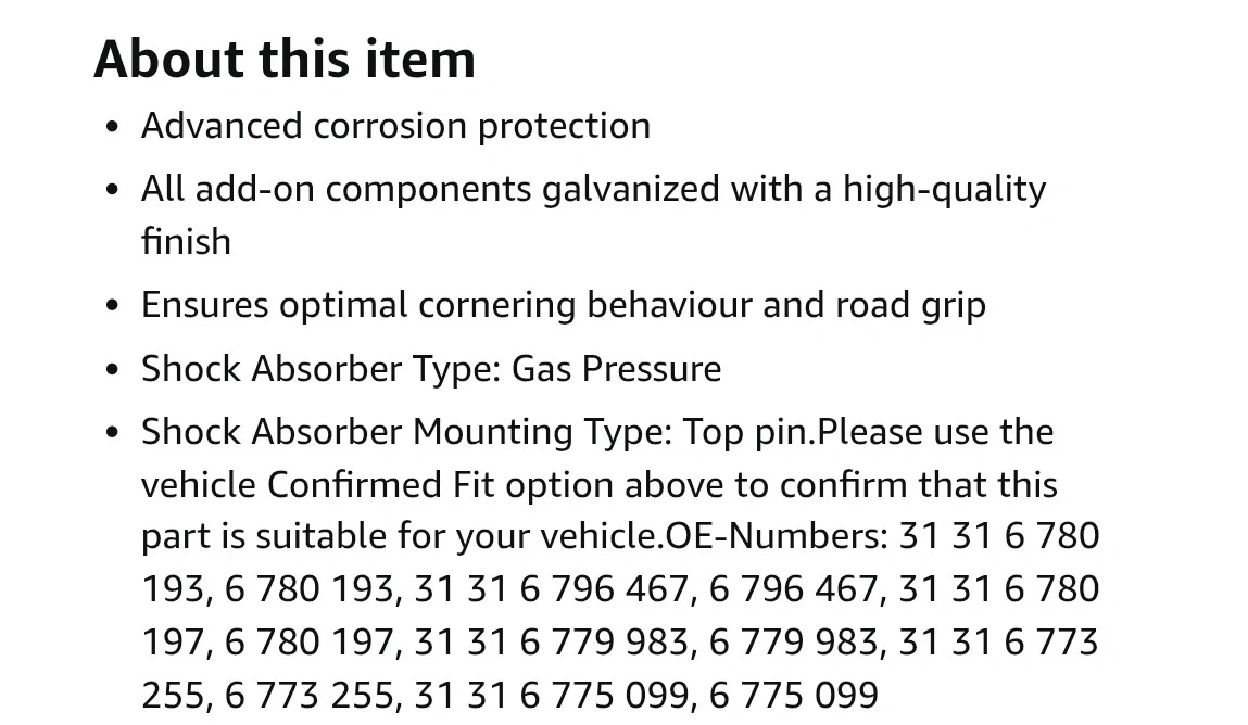 This shock absorber offers advanced corrosion protection with a high-quality galvanized finish on all add-on components. It's designed to ensure optimal cornering behaviour and road grip. The mounting type is top pin. This is a gas pressure shock absorber.
