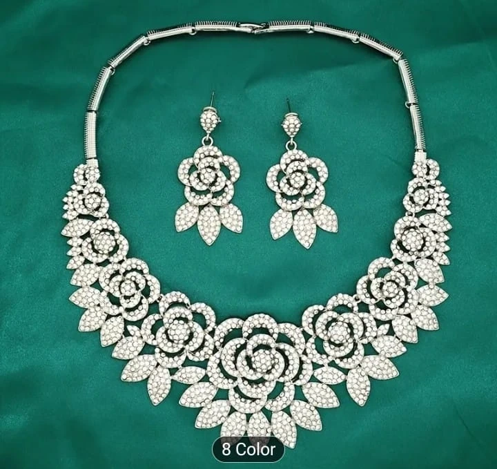 Selling a beautiful silver floral jewelry set! This set includes a necklace, ring, earrings, and a bracelet. It's in great condition and would be perfect for a special occasion or to add a touch of elegance to any outfit