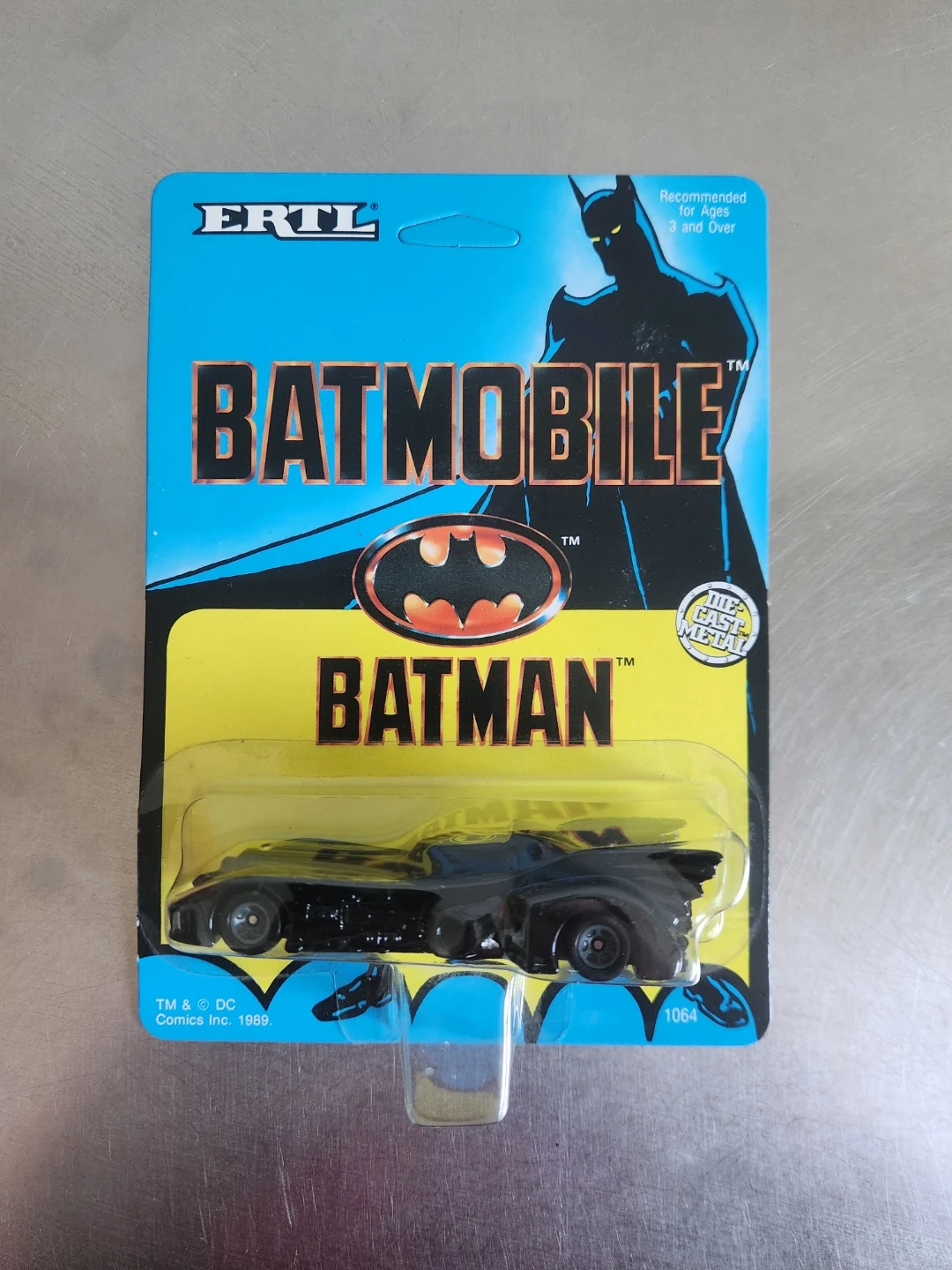 This is an ERTL Batmobile die-cast toy car from 1989. It's a 1/64 scale model, great for collectors or fans of Batman. The packaging indicates it's made of die-cast metal and recommended for ages 3 and over.