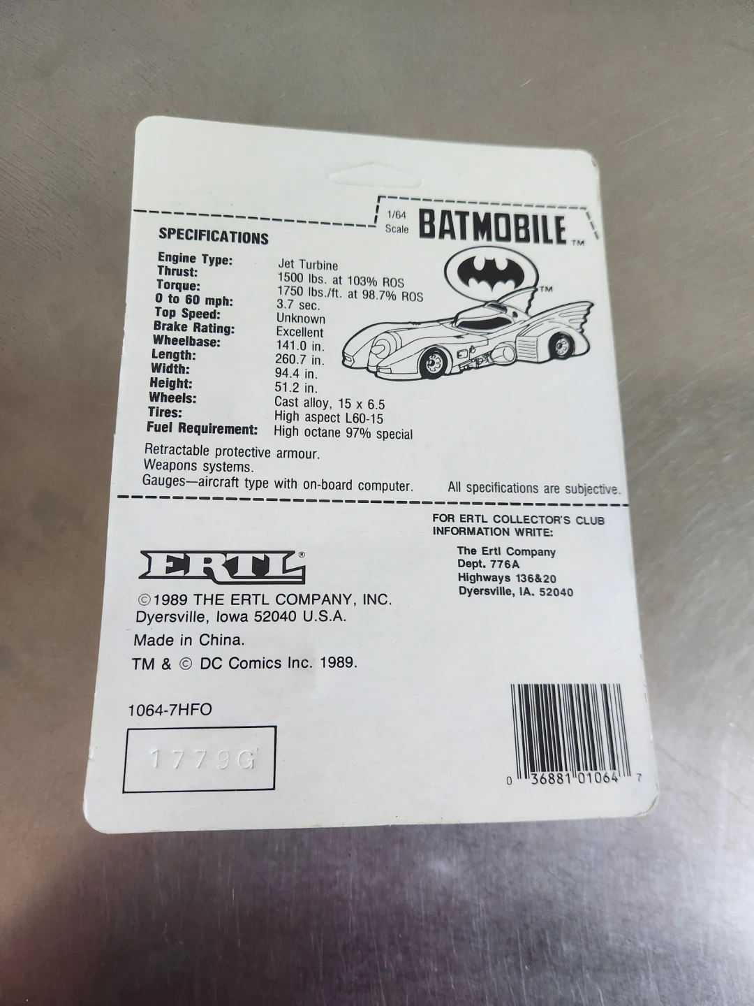 This is an ERTL Batmobile die-cast toy car from 1989. It's a 1/64 scale model, great for collectors or fans of Batman. The packaging indicates it's made of die-cast metal and recommended for ages 3 and over.