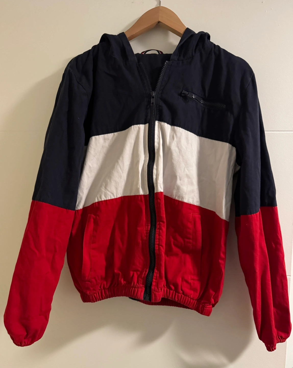One size fits most (xs-medium) Good spring jacket! Rare. Lined and hits slightly oversized, has a hood, a zippered pocket on the chest and two pockets + cinching at the bottom. Great condition, only worn 1-3 times, just been in storage.