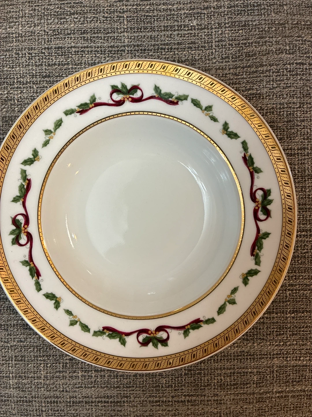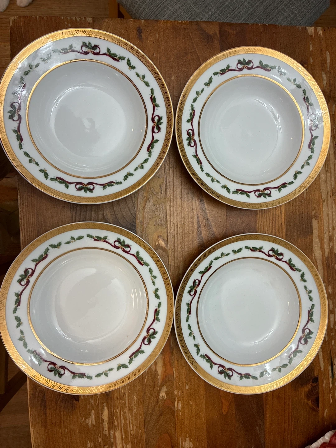 Set of four 8.5” Mantles soup bowls featuring a festive holly and ribbon design with gold trim. Porcelain material. Dishwasher safe for easy cleanup!