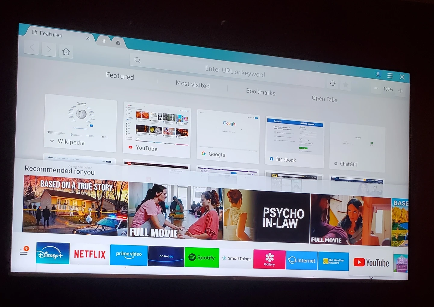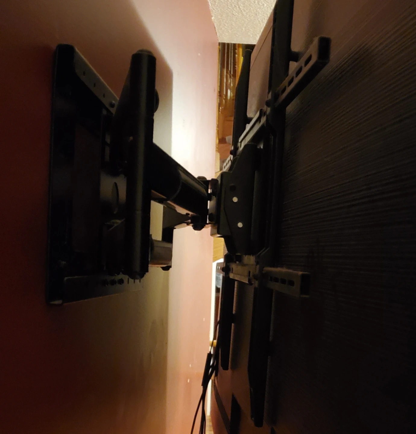 75 inch smart TV, comes with wallmount that extends if you want it to. Works great. Has a remote.