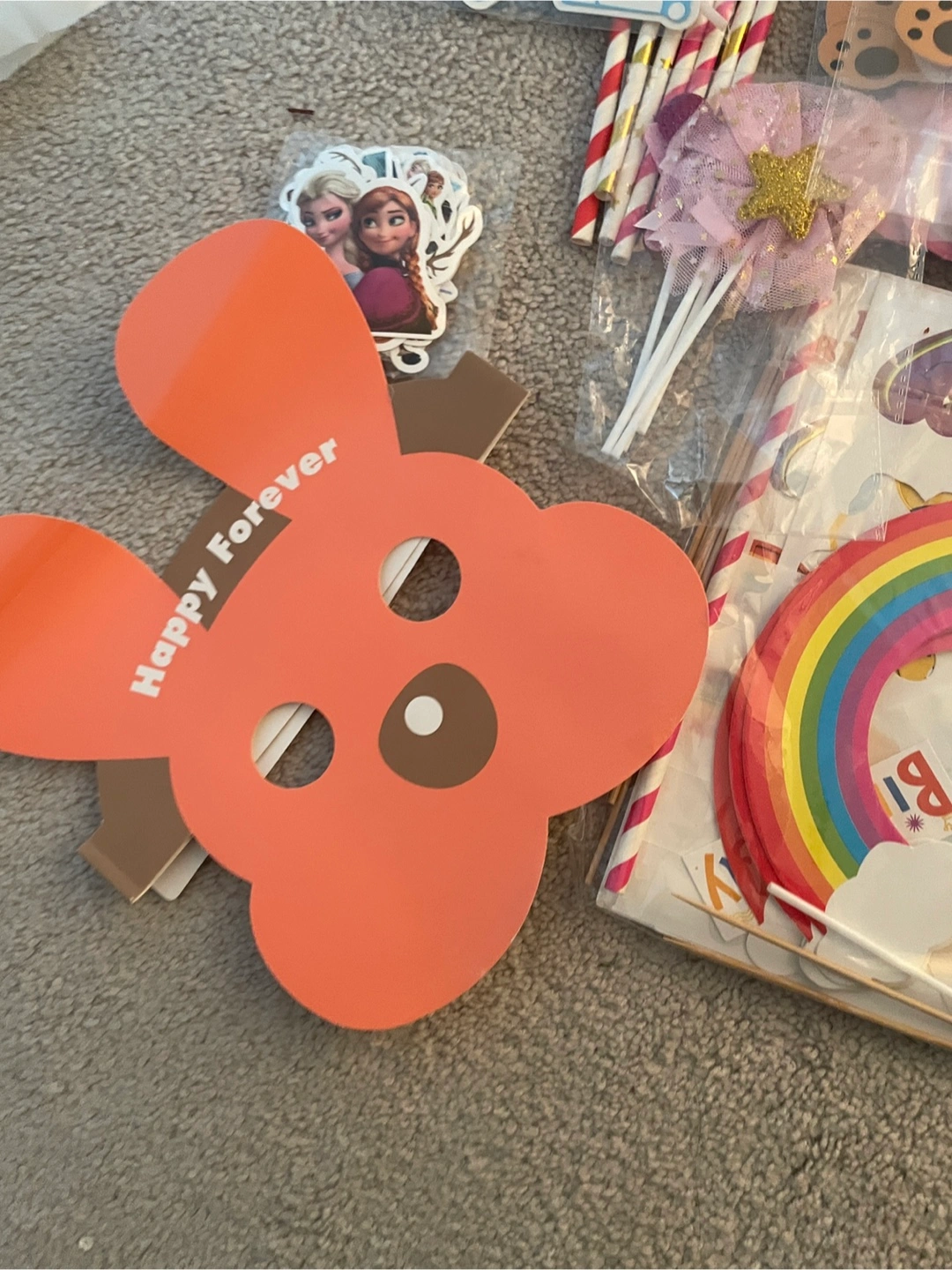 This set includes various birthday decorations like cake toppers, paper straws, and stickers. Features include a cute tiger design, rainbow accents, and Frozen-themed stickers. It's perfect for celebrating a child's birthday party!