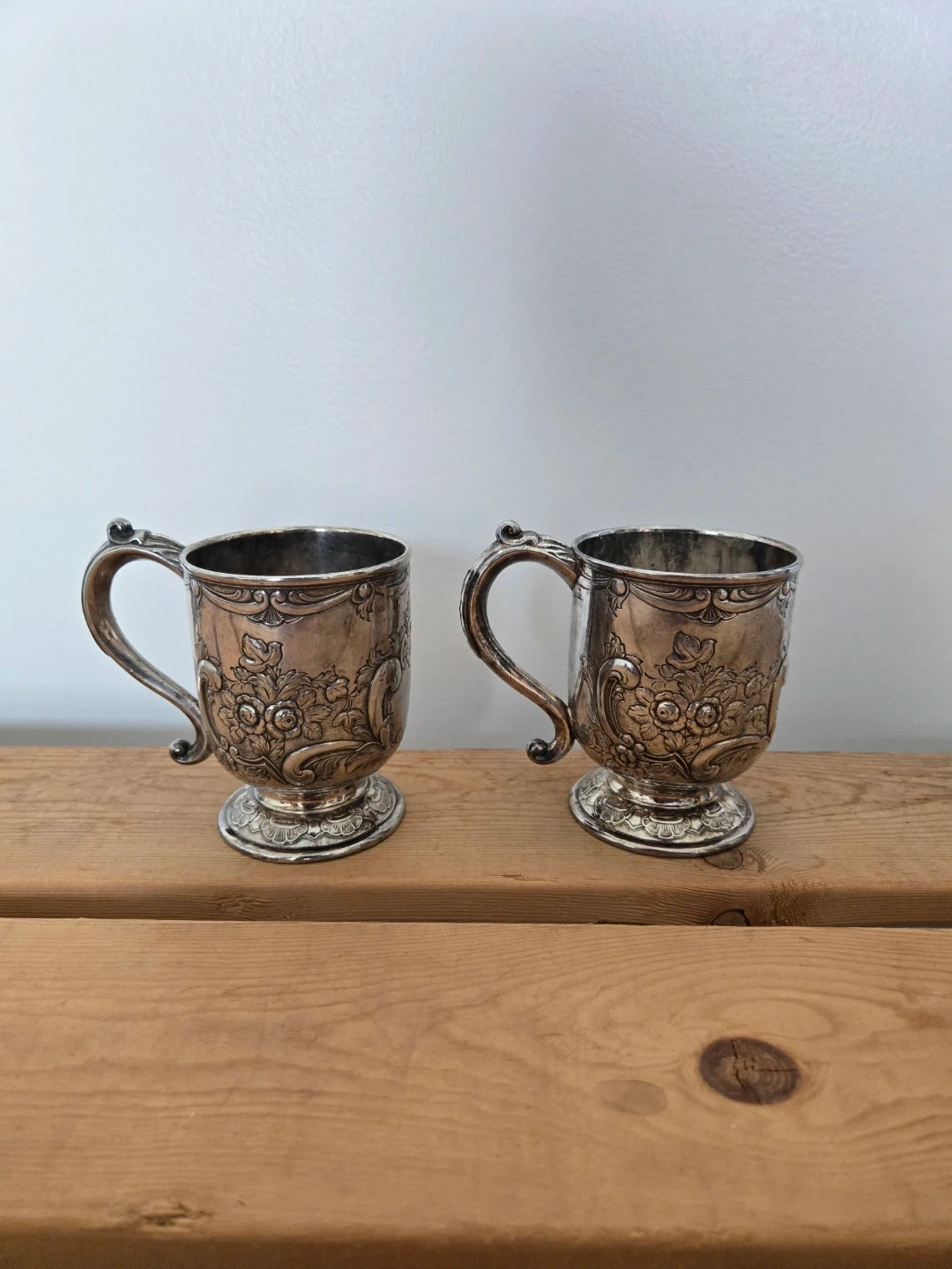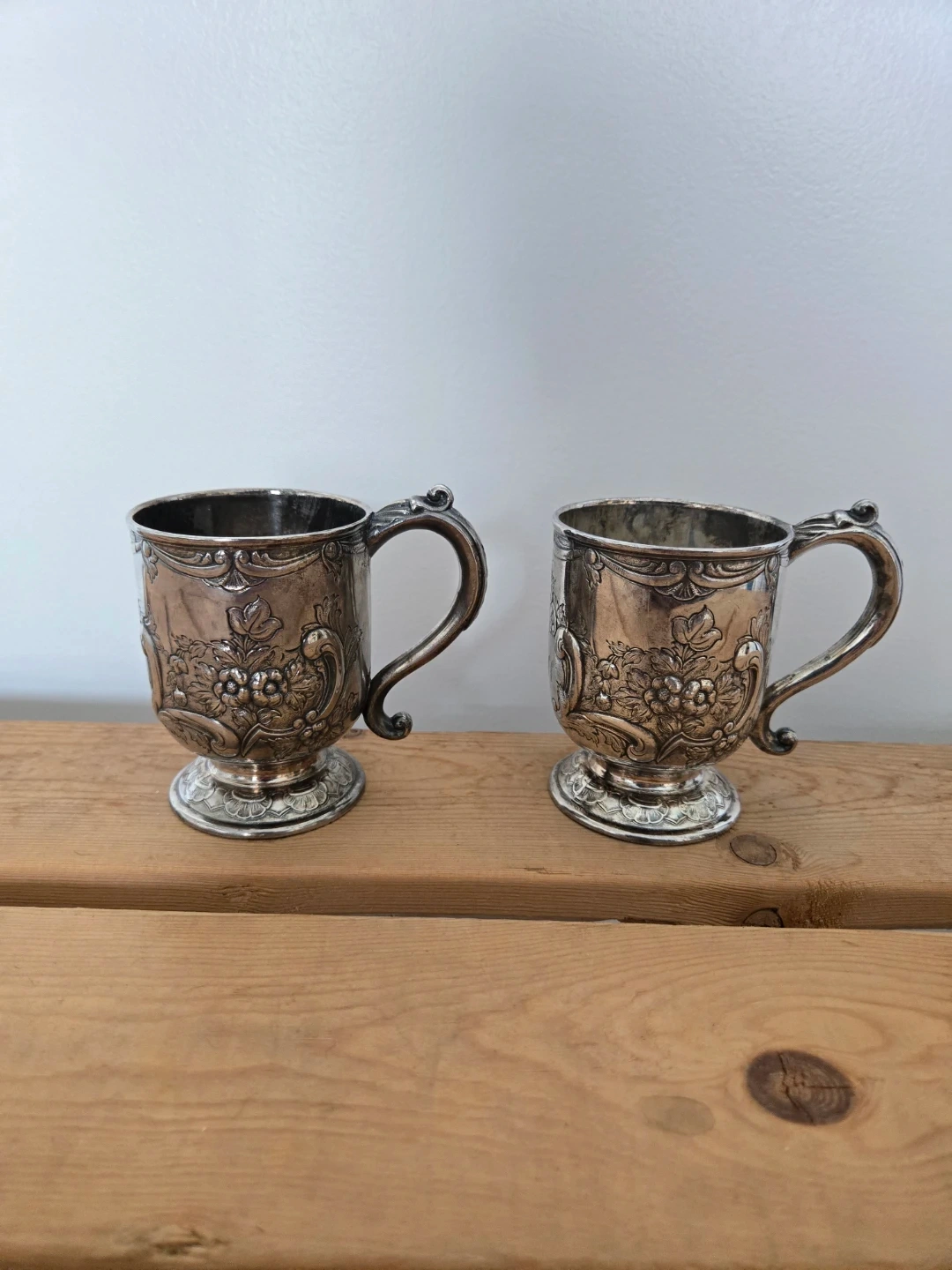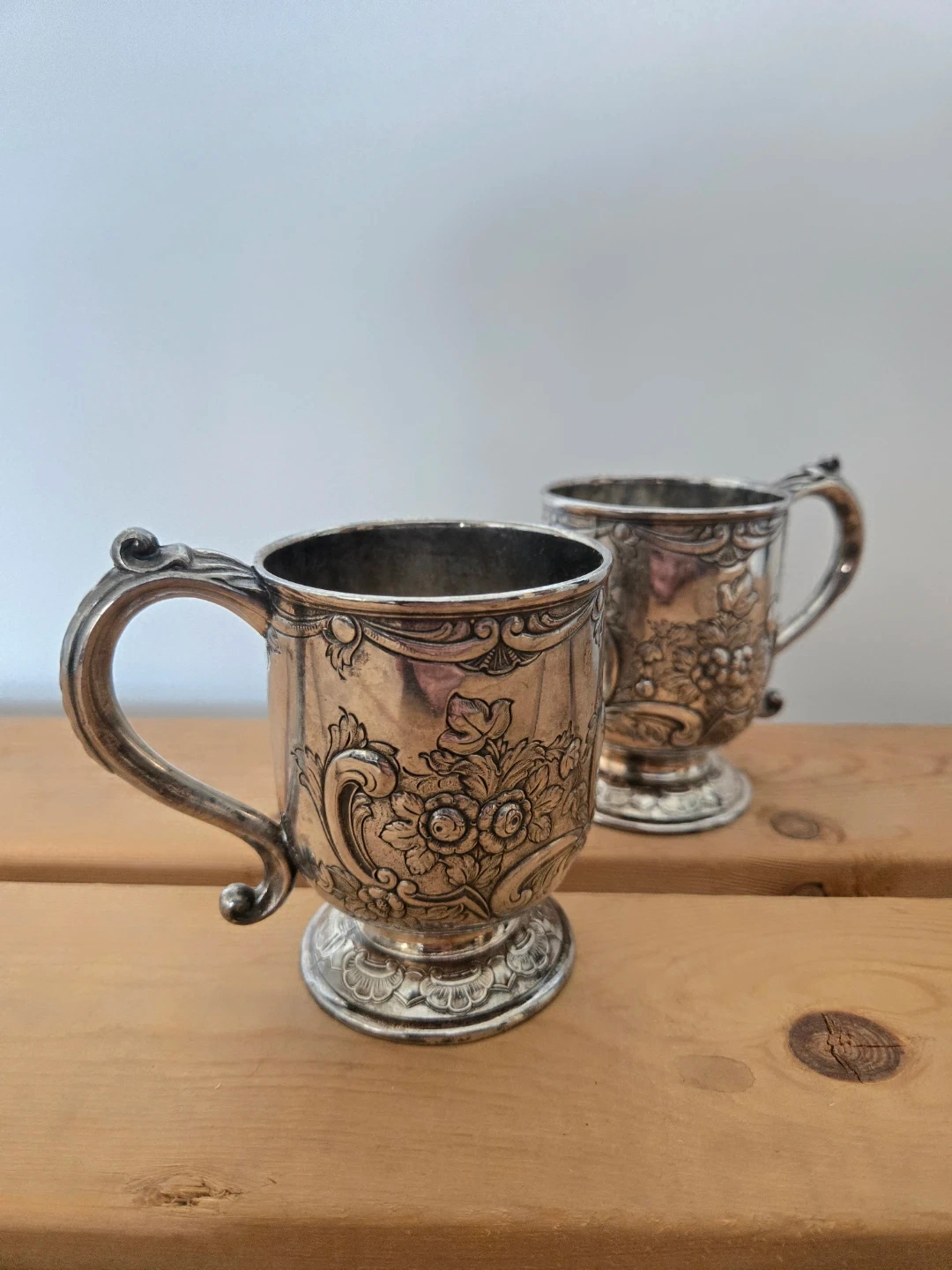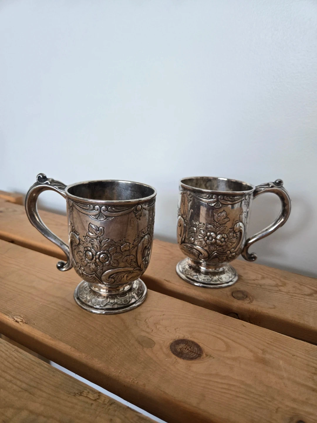 Two decorative silver-plated cups with ornate floral etchings. These cups have a vintage aesthetic and a polished finish. They would make a lovely decorative item for a shelf or display cabinet.