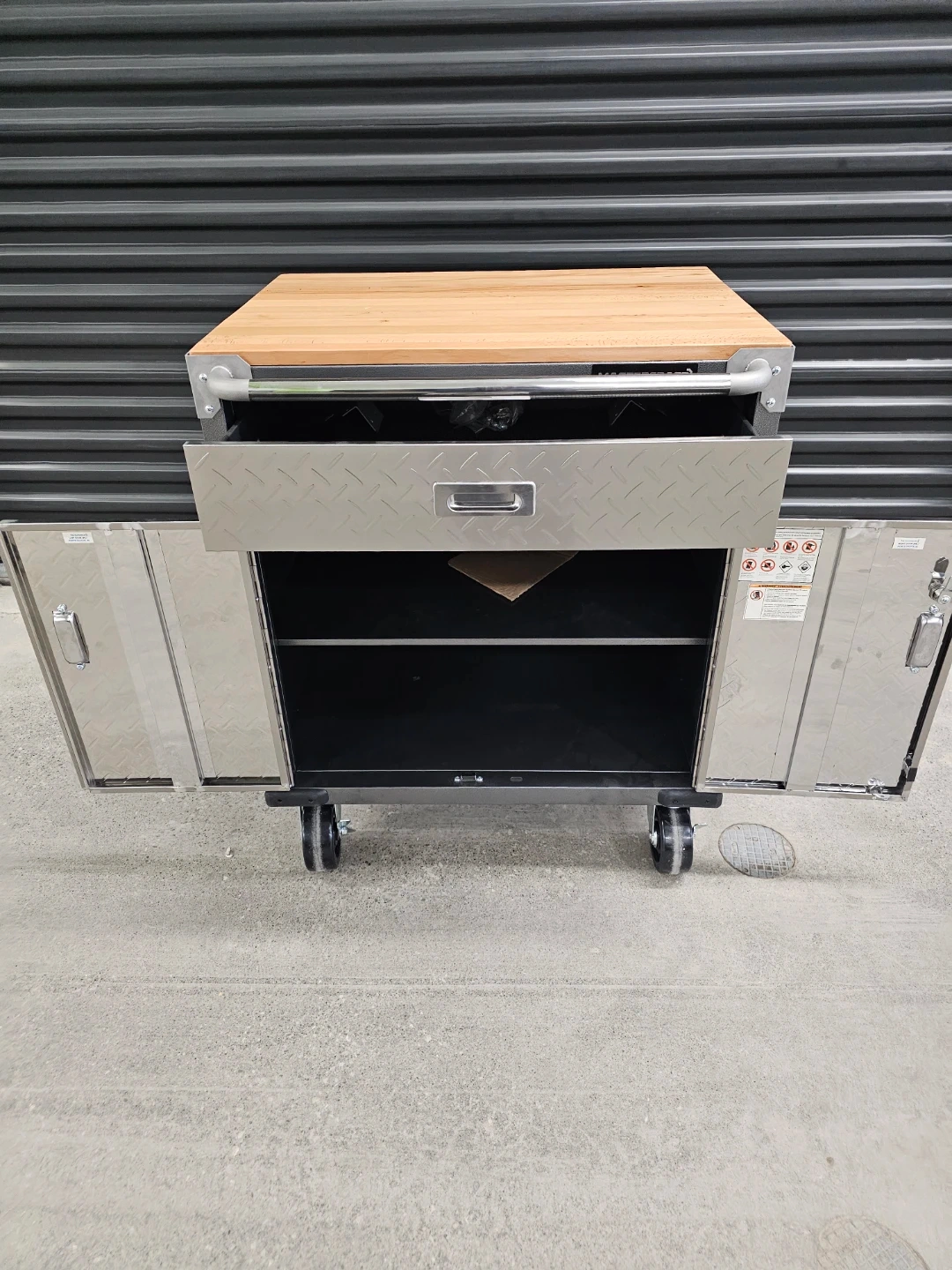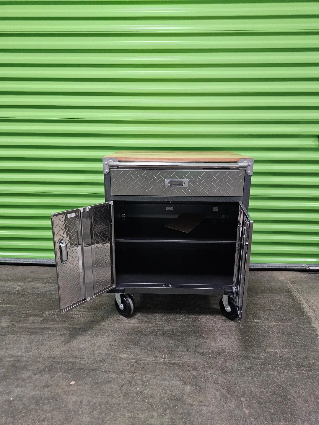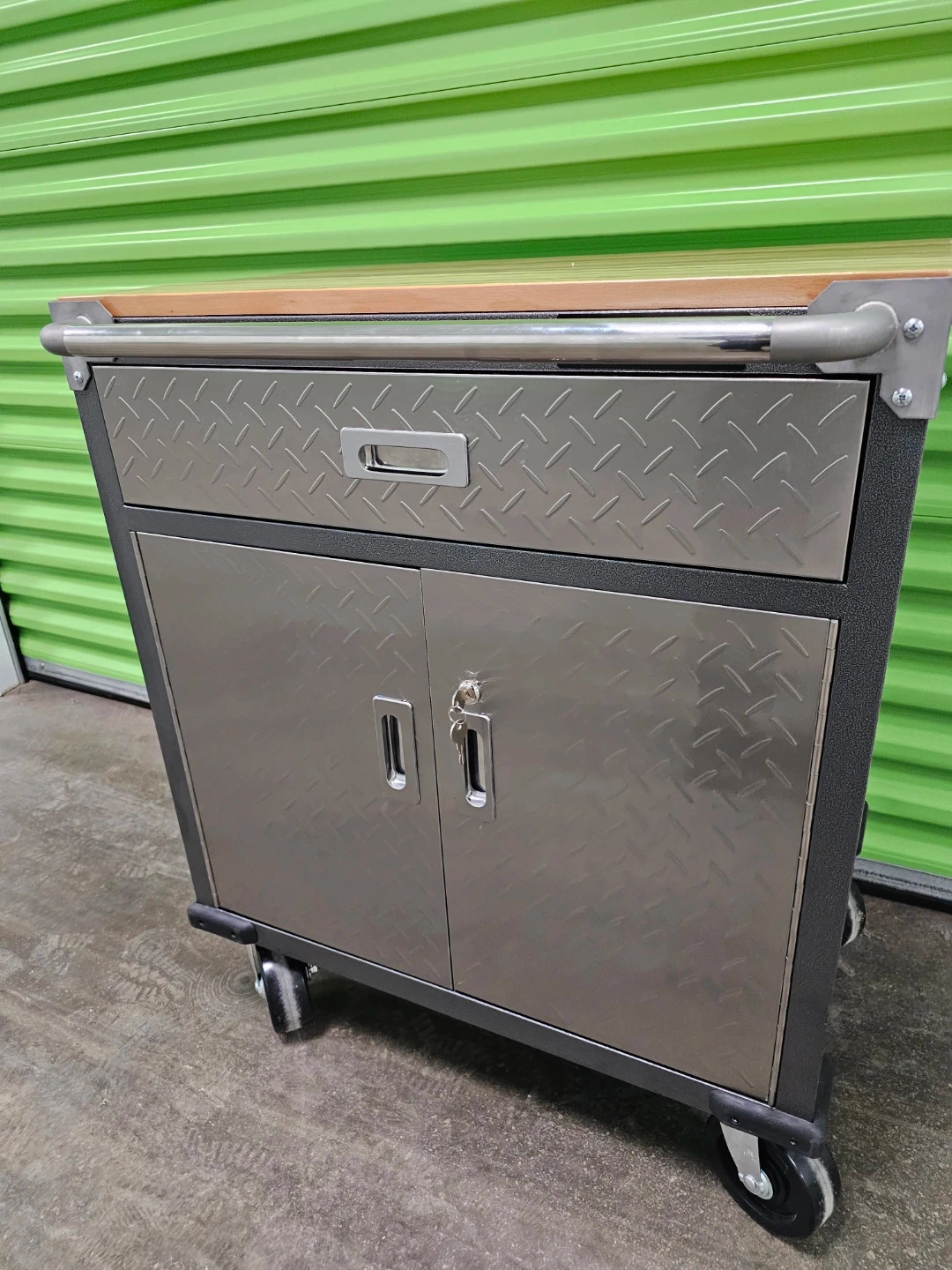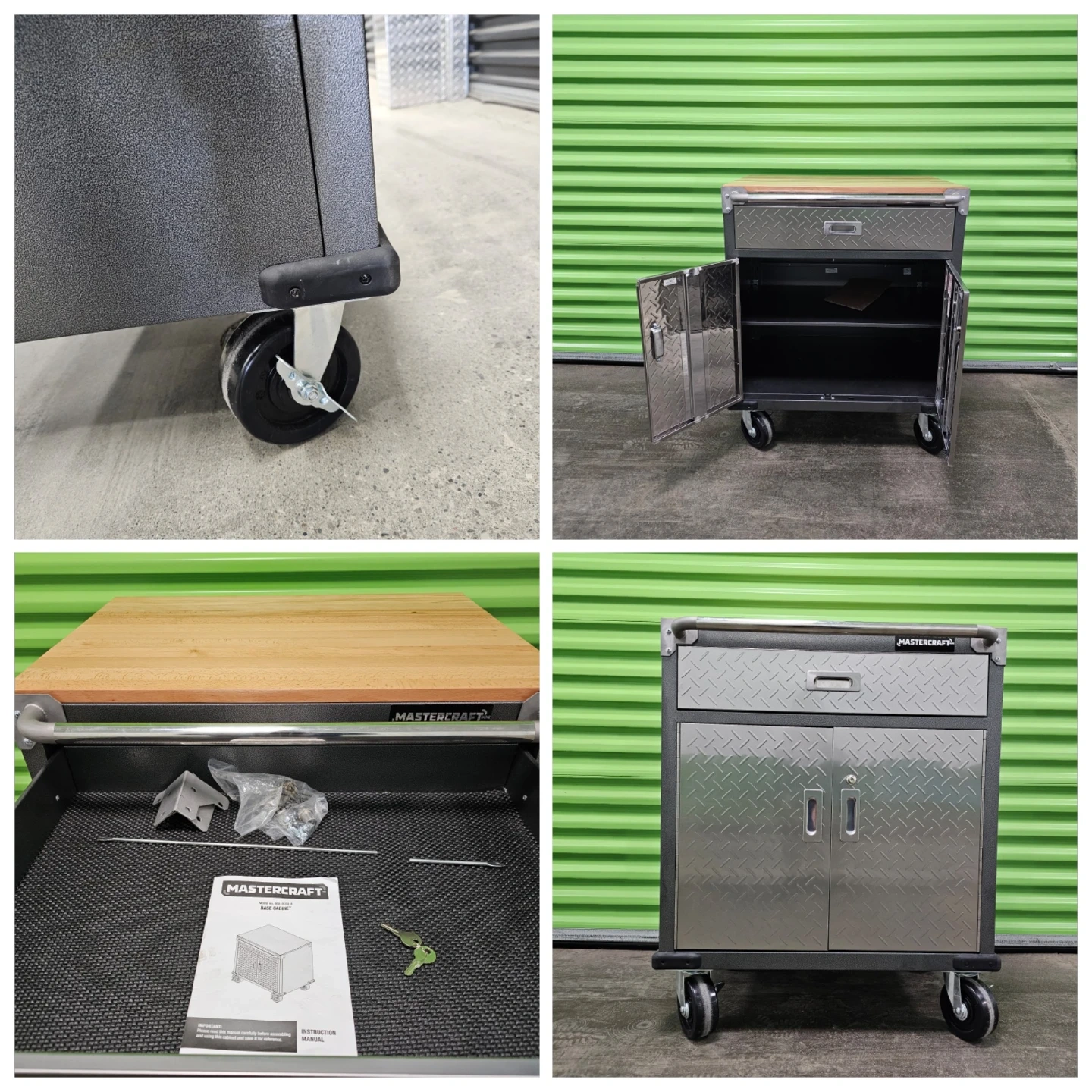 Mastercraft rolling tool chest with a butcher block top. It features one drawer and a two-door cabinet below. Includes keys and some hardware.